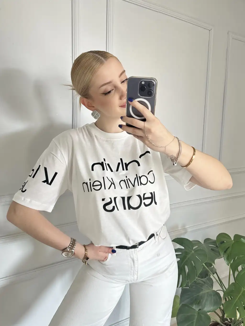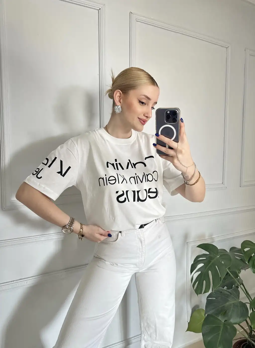 Baskılı Orijinal Marka Oversize Pamuk Beyaz Tshirt