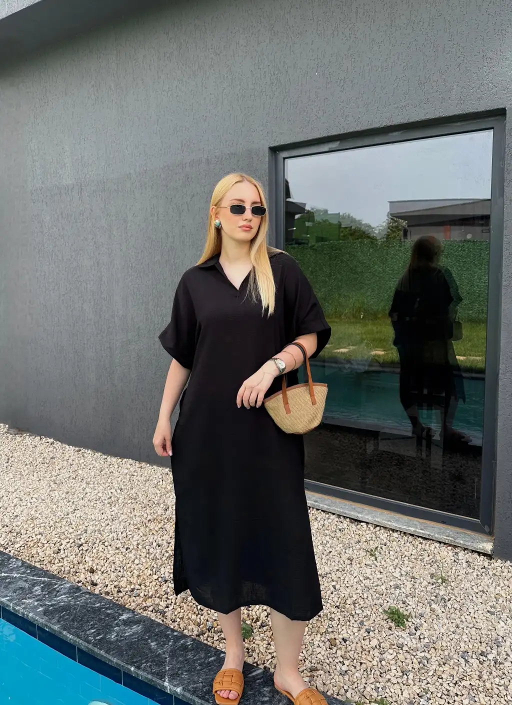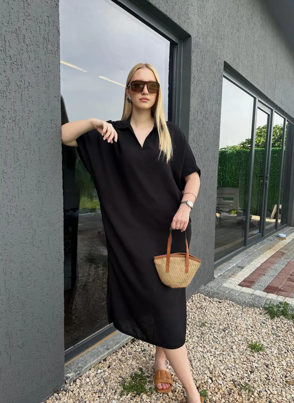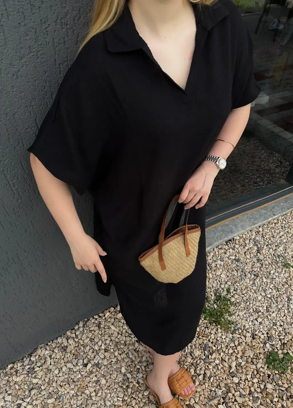 Bohem Siyah Keten Polo Yaka Elbise