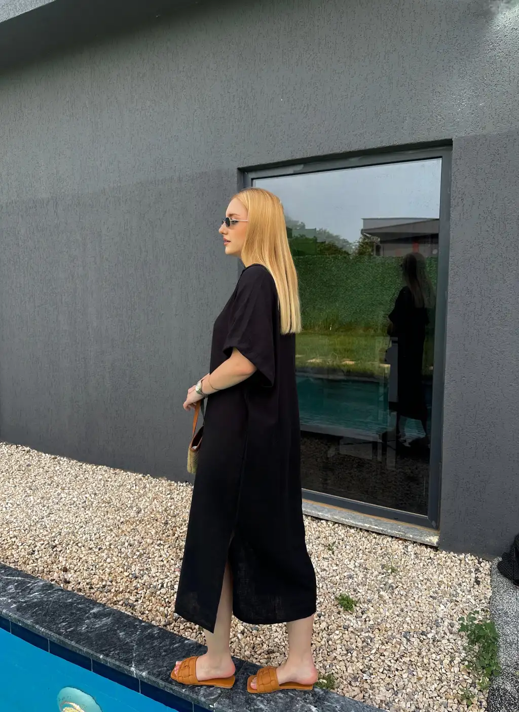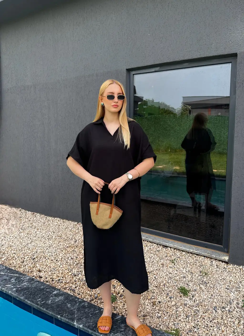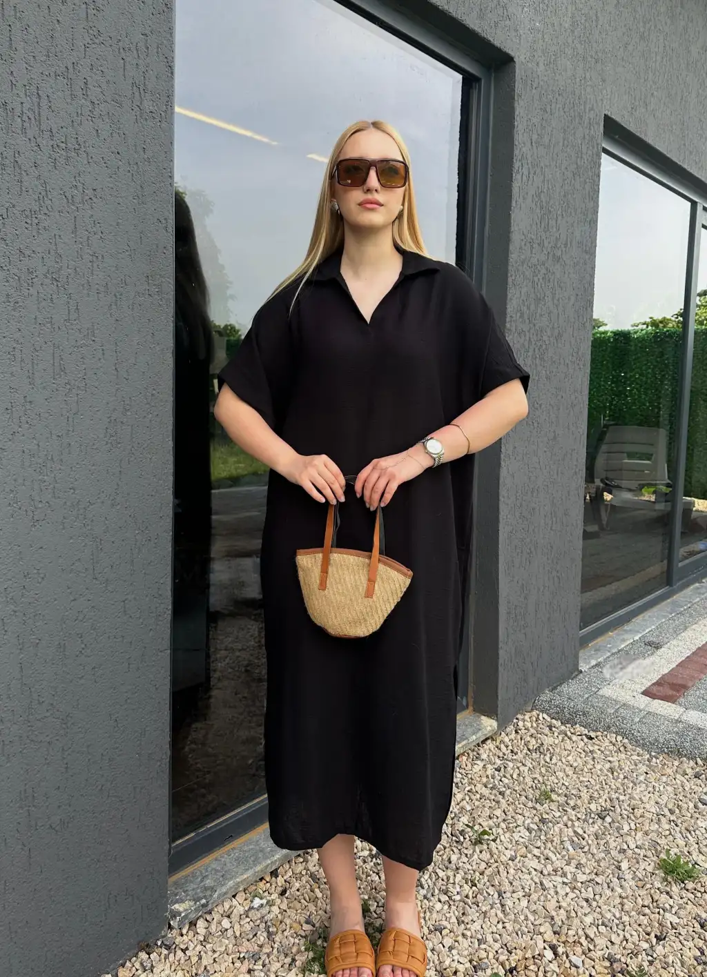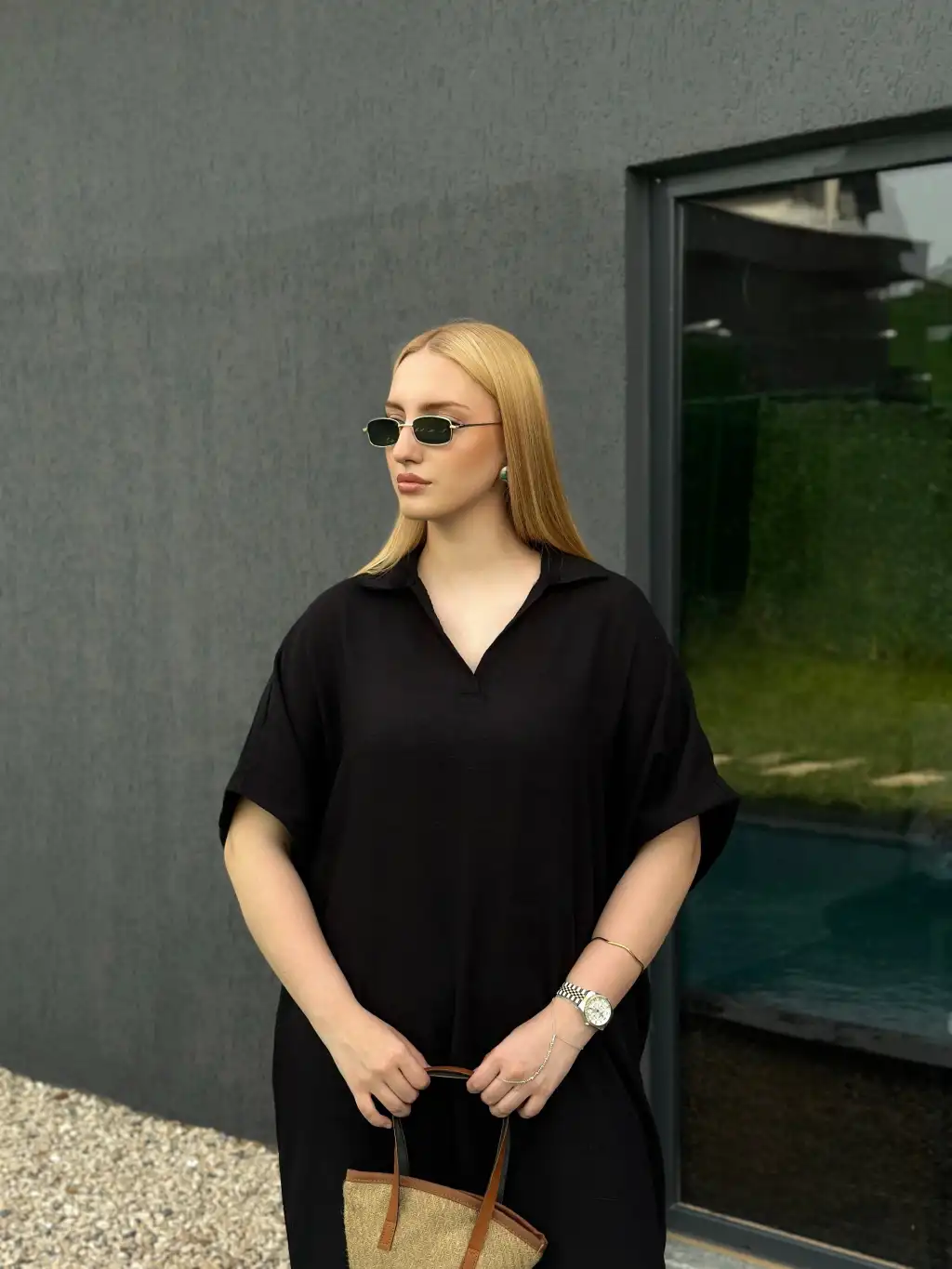 Bohem Siyah Keten Polo Yaka Elbise