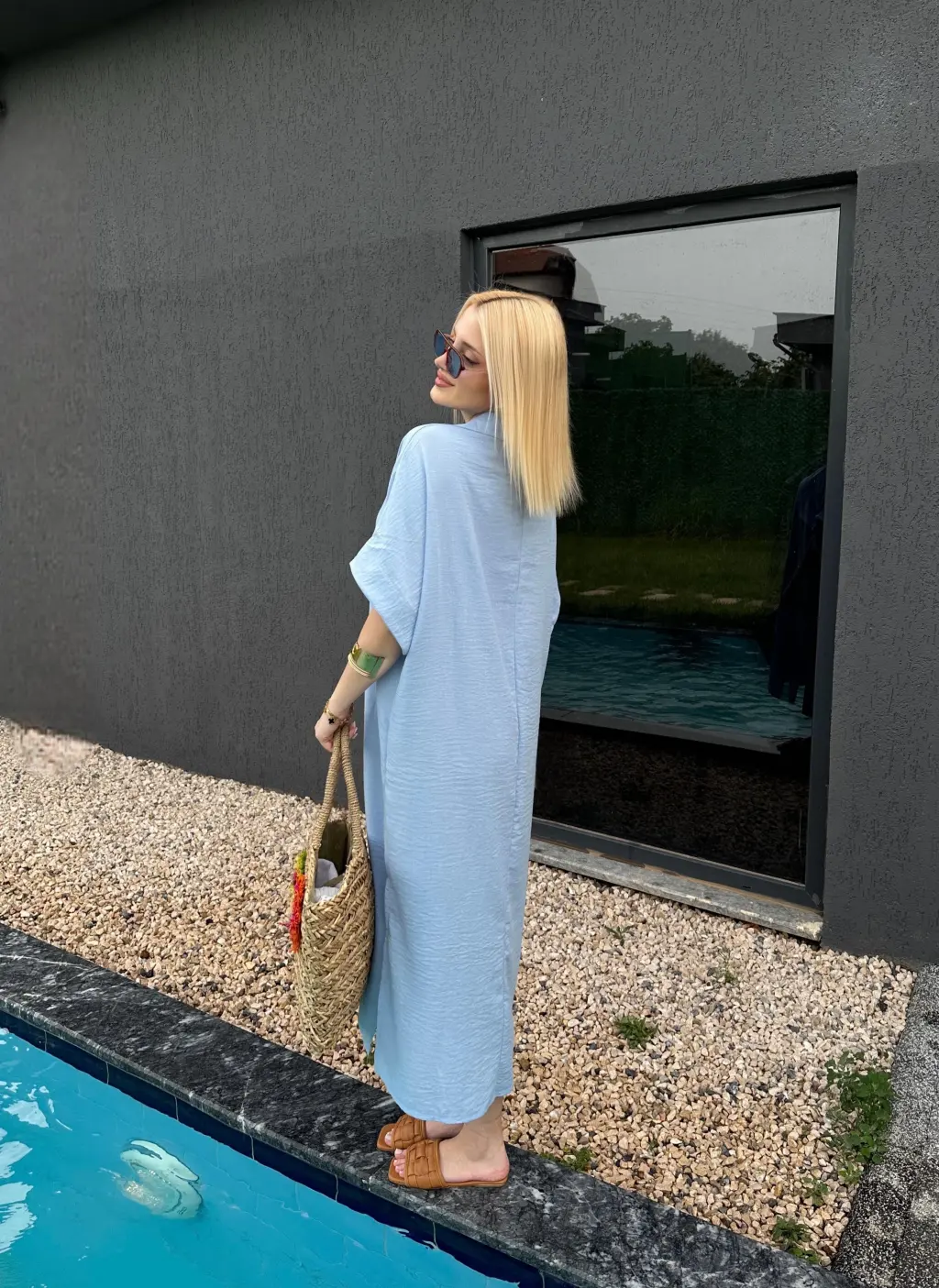Bohem BebeMavi Keten Polo Yaka Elbise