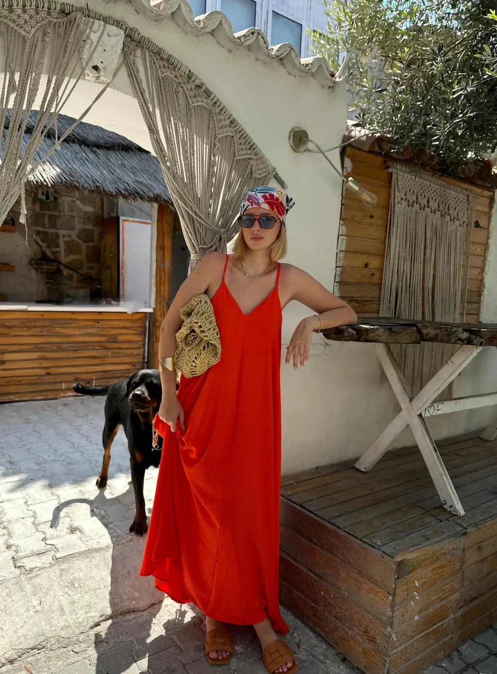 Bohemian Turuncu Ayarlanabilir İp Askılı Salaş Elbise