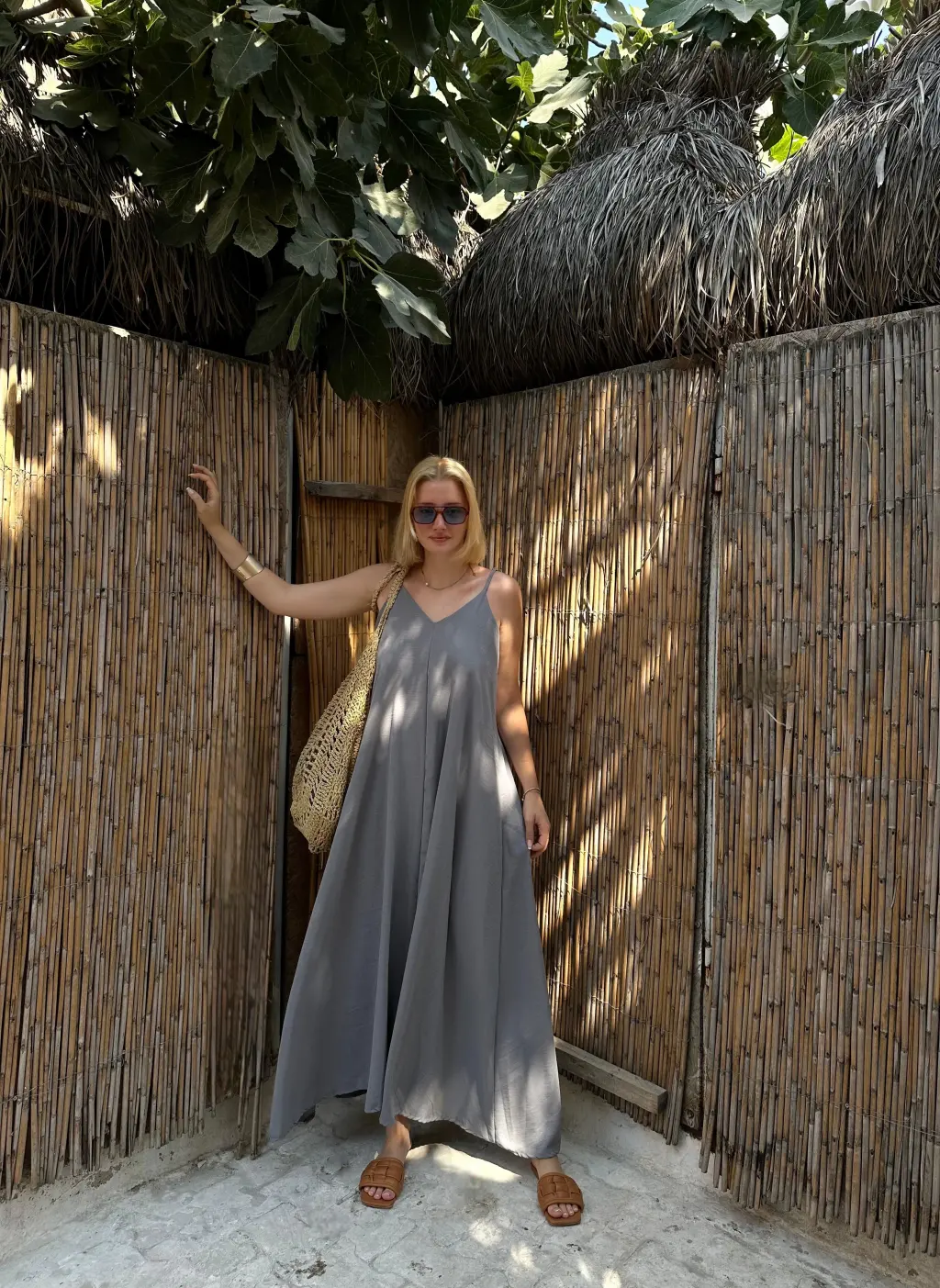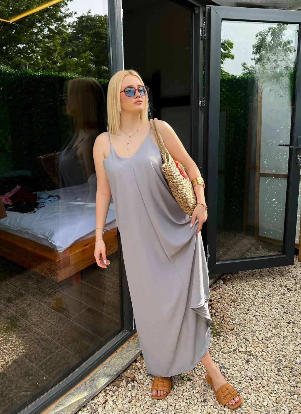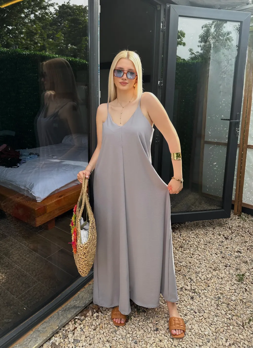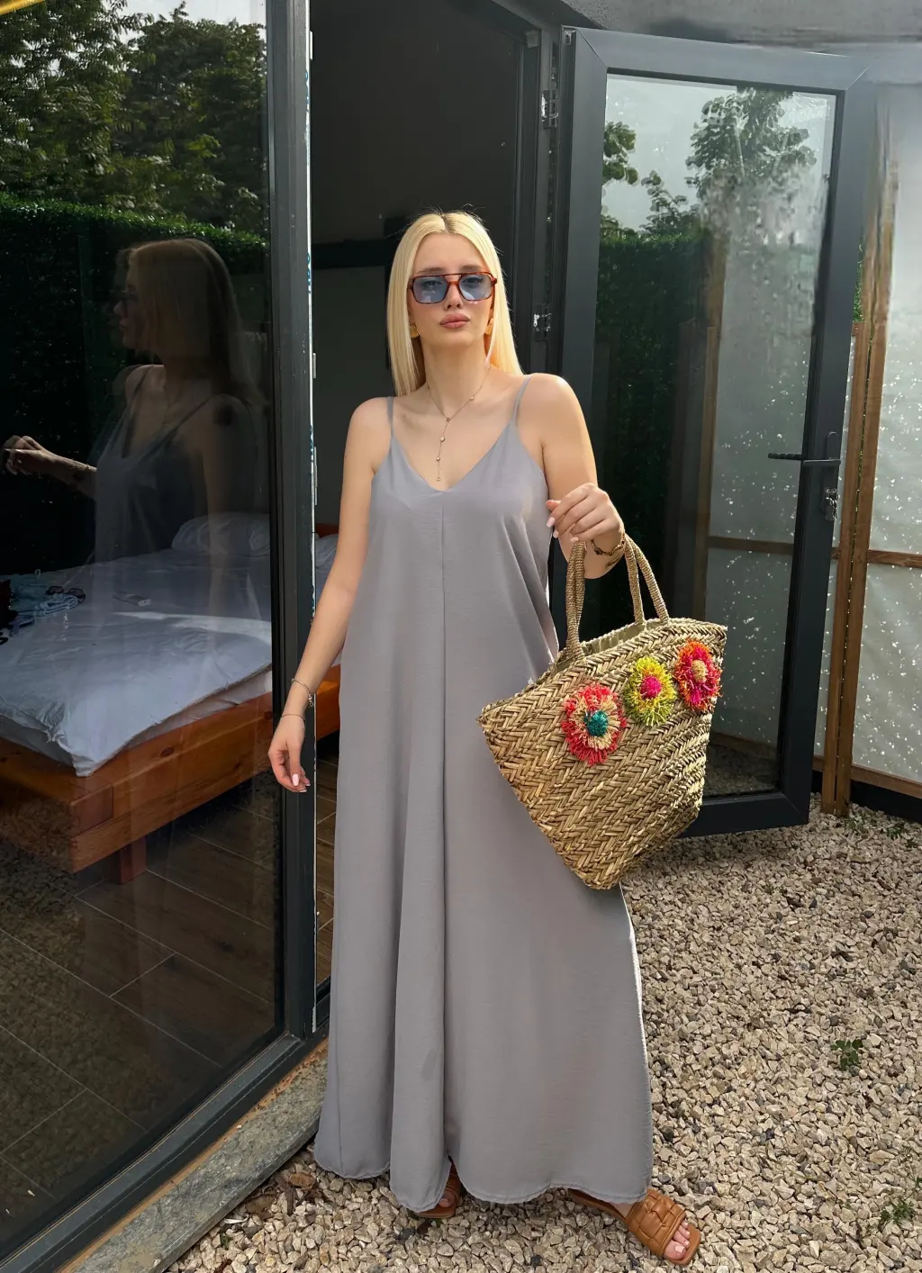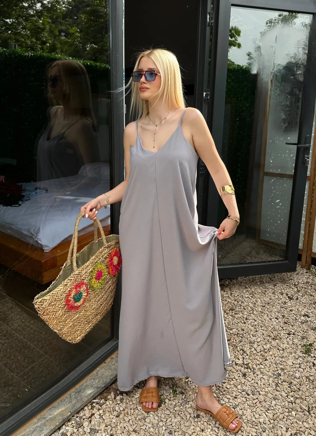 Bohemian Gri Ayarlanabilir İp Askılı Salaş Elbise