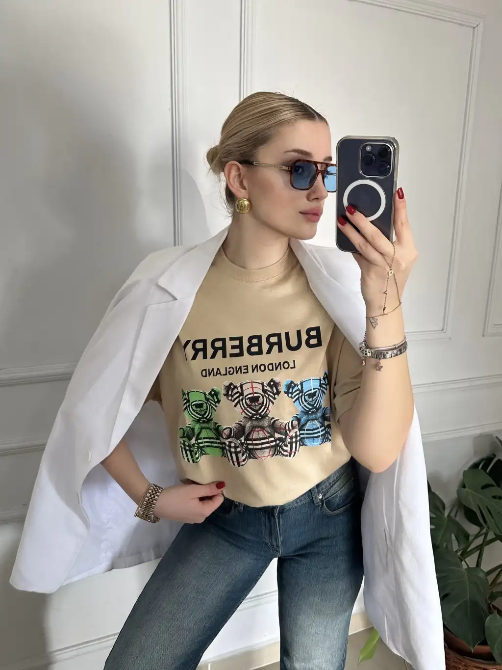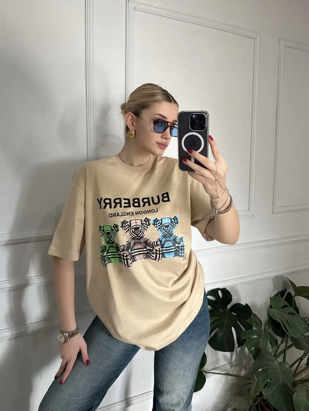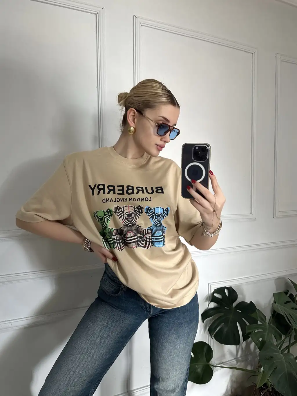 Burbe Bej Ayıcık Baskılı %100 Pamuk Orijinal Marka Etiketli Oversize Tshirt