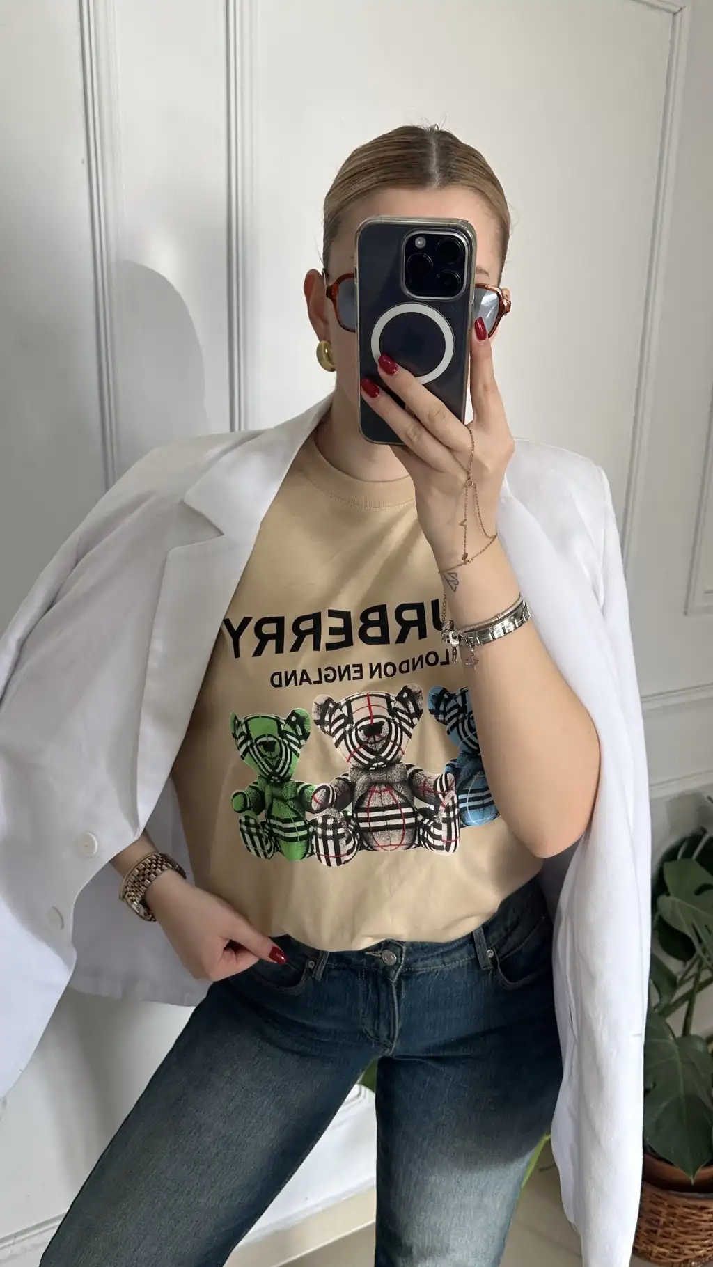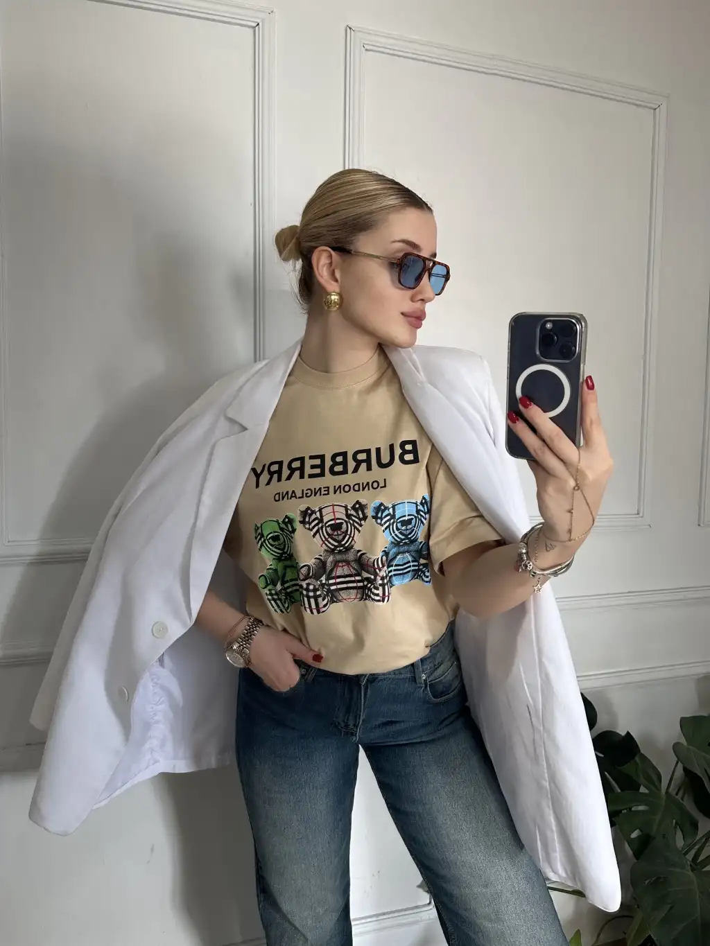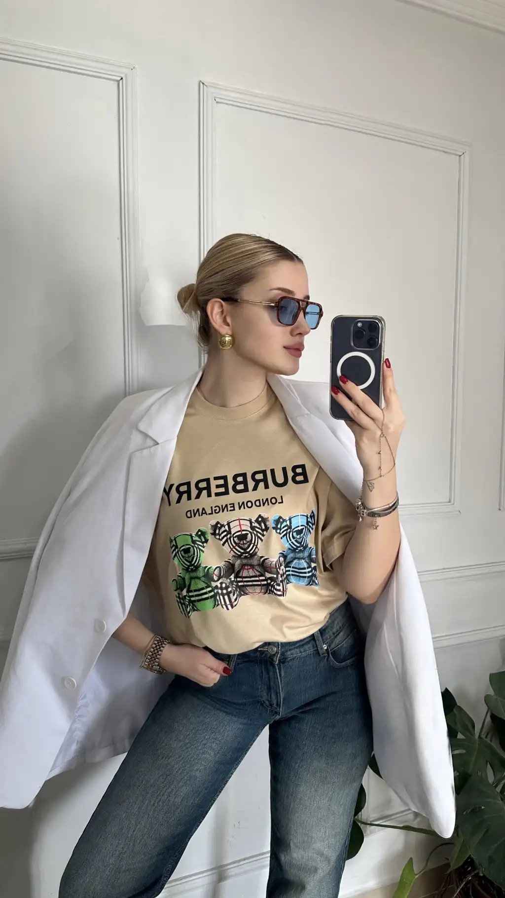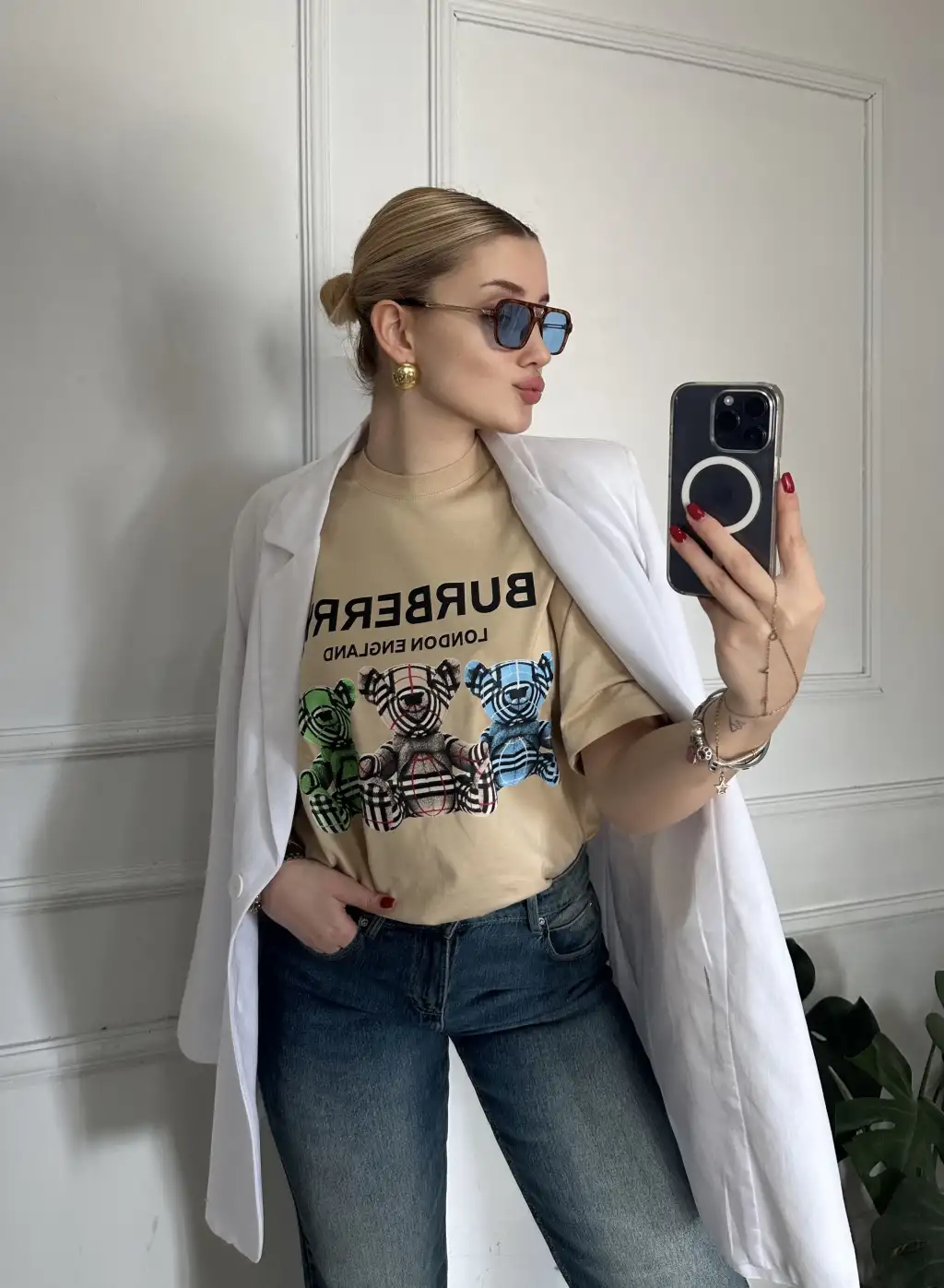 Burbe Bej Ayıcık Baskılı %100 Pamuk Orijinal Marka Etiketli Oversize Tshirt