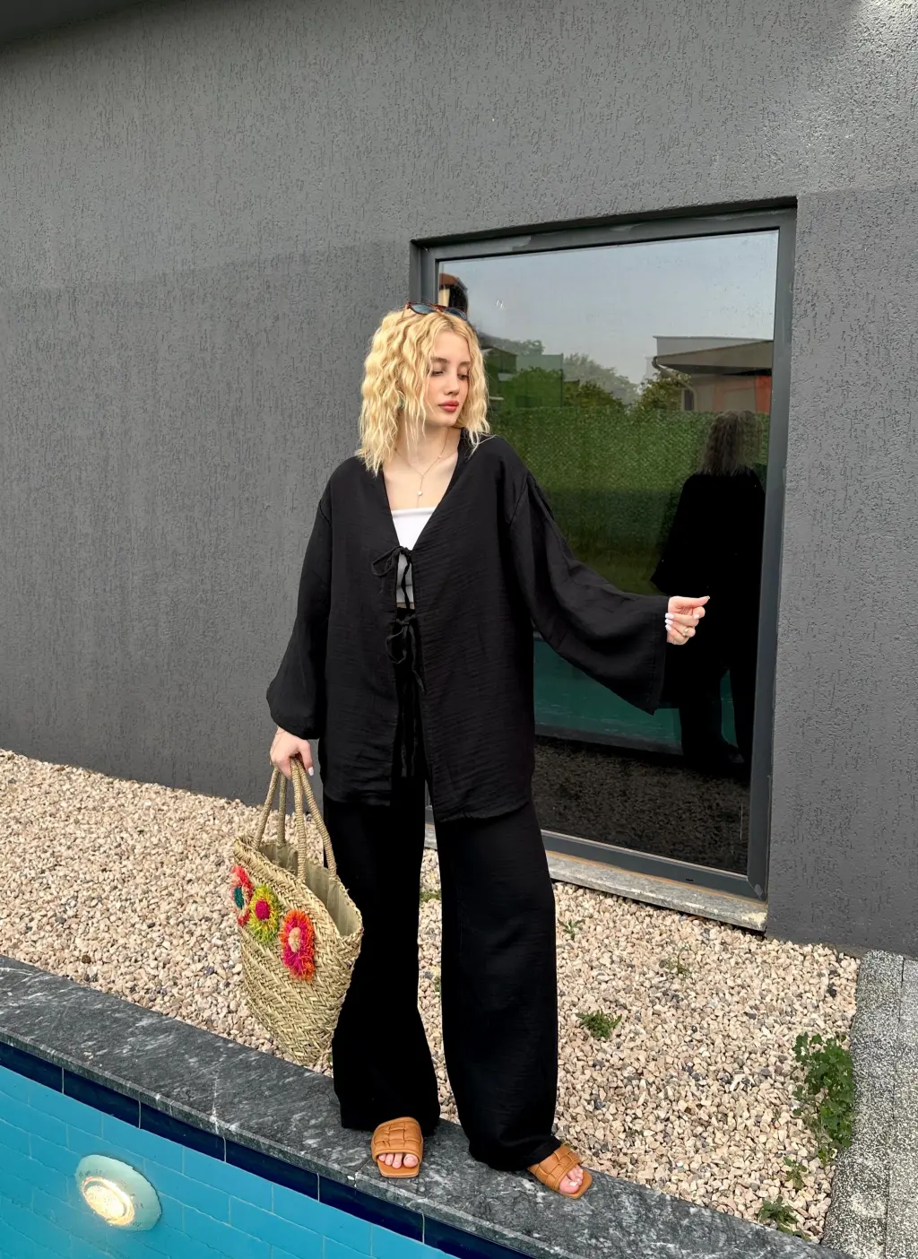 Ferina Siyah Muslin Ön Bağlamalı Kimono Takım