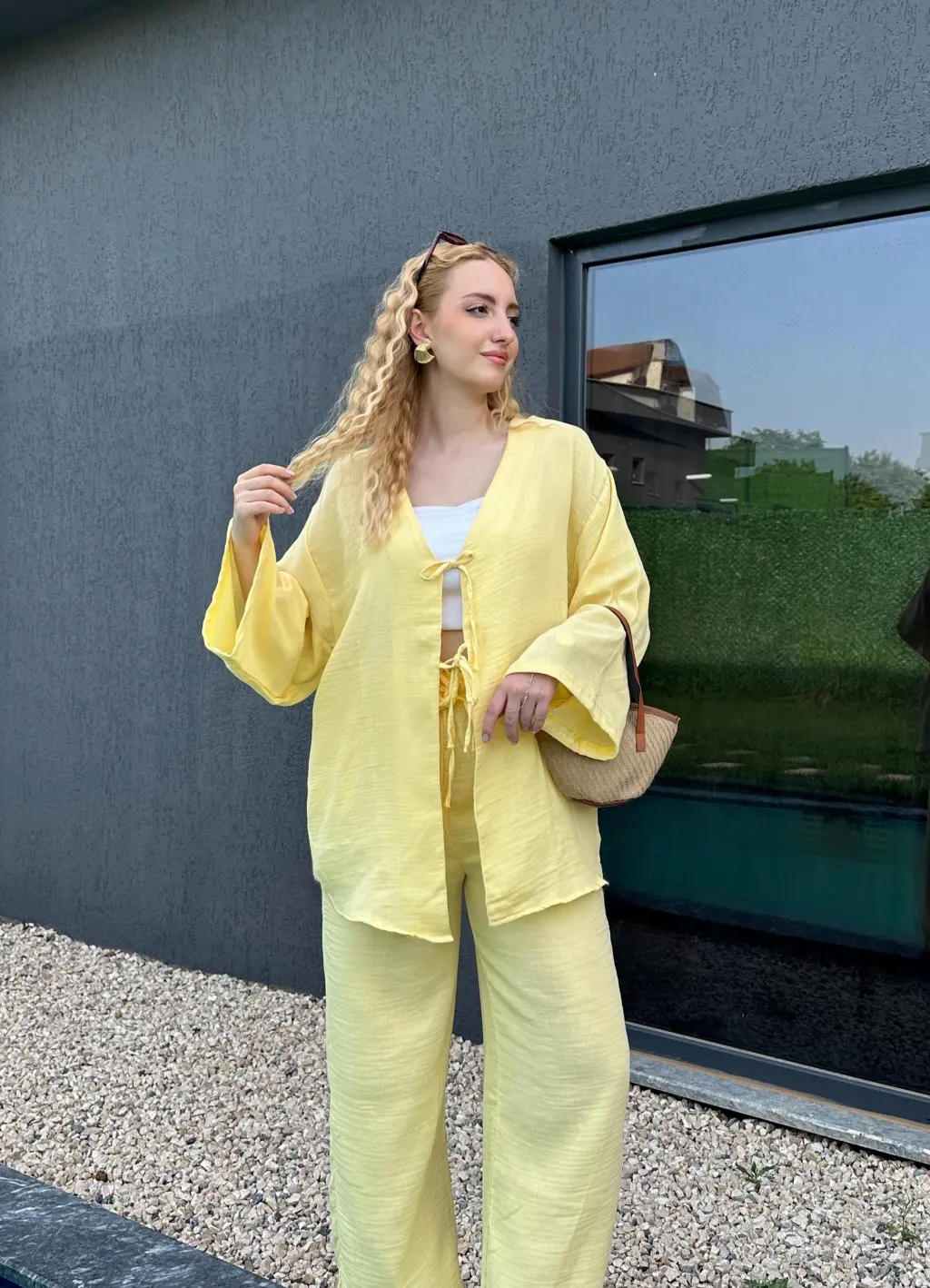 Ferina Pastel Sarı Muslin Ön Bağlamalı Kimono Takım