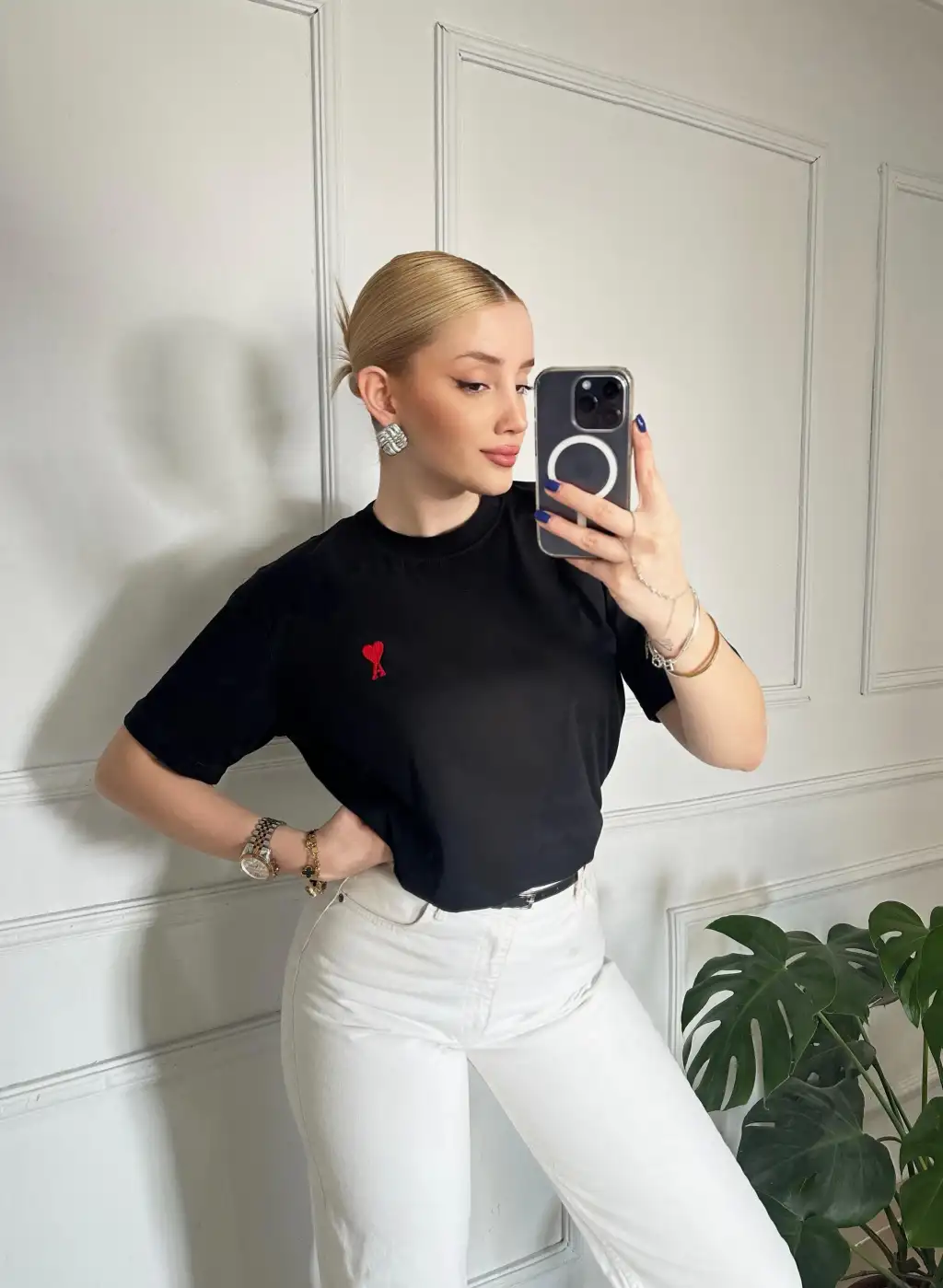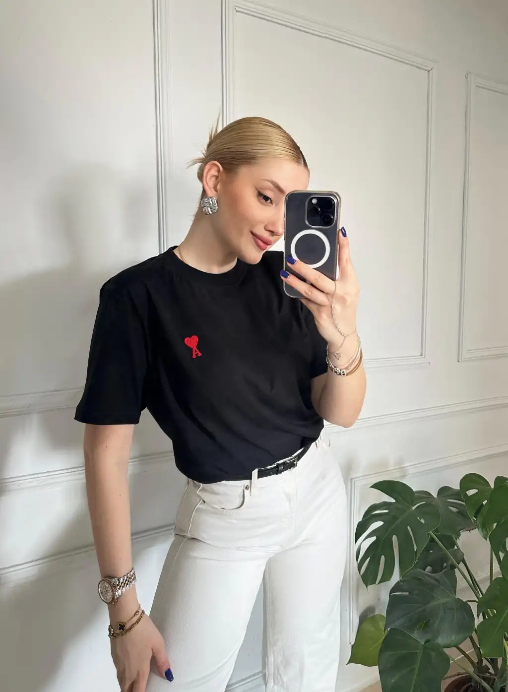Kalp Nakış Orijinal Marka Oversize Pamuk Siyah Tshirt