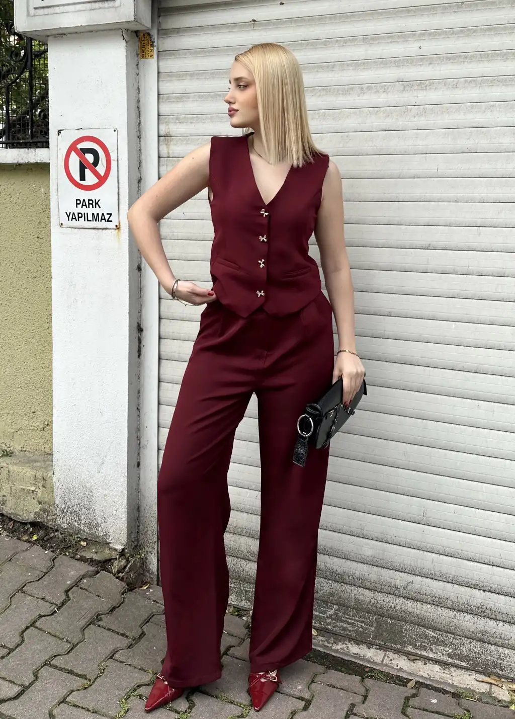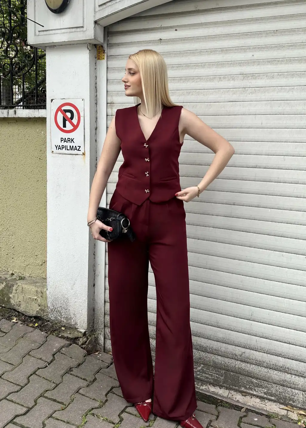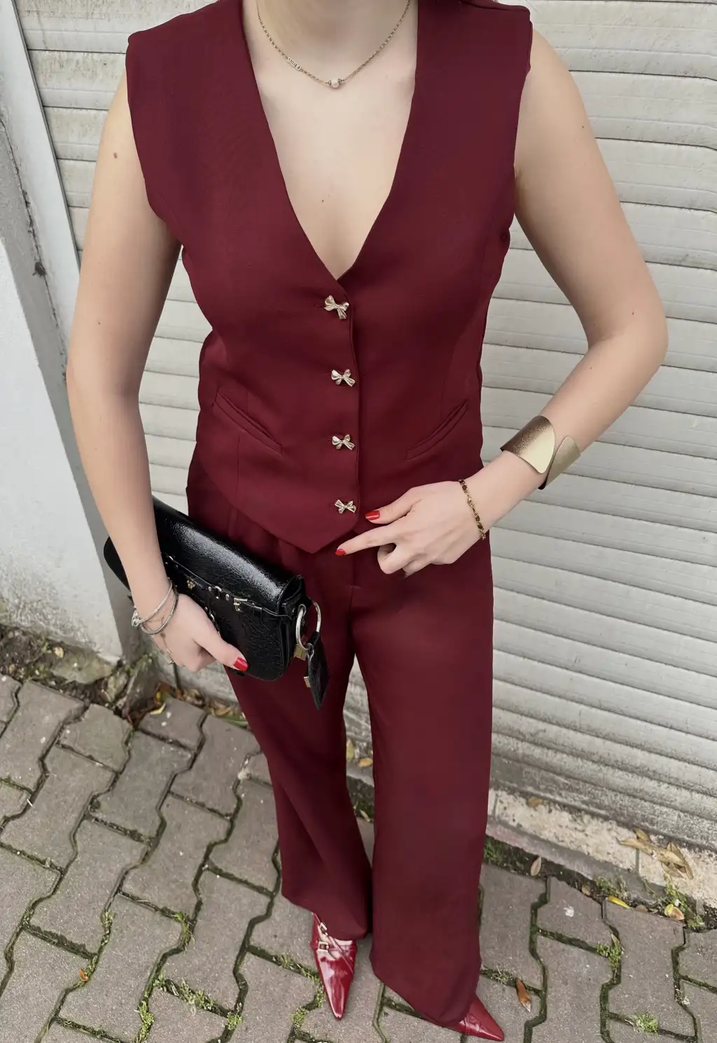 Laris Bordo Gold Kelebek Düğme Yelek Pantolon Takım