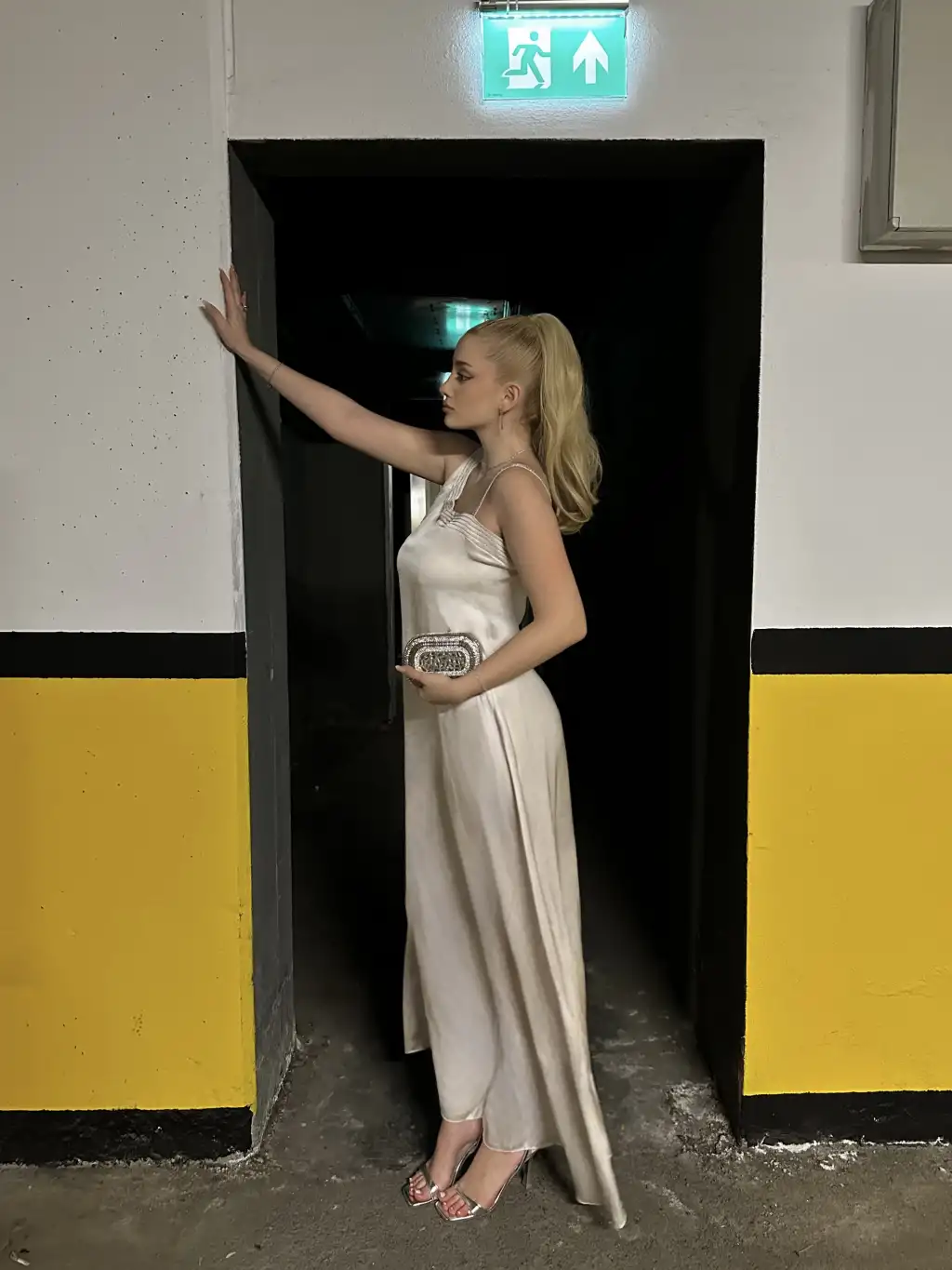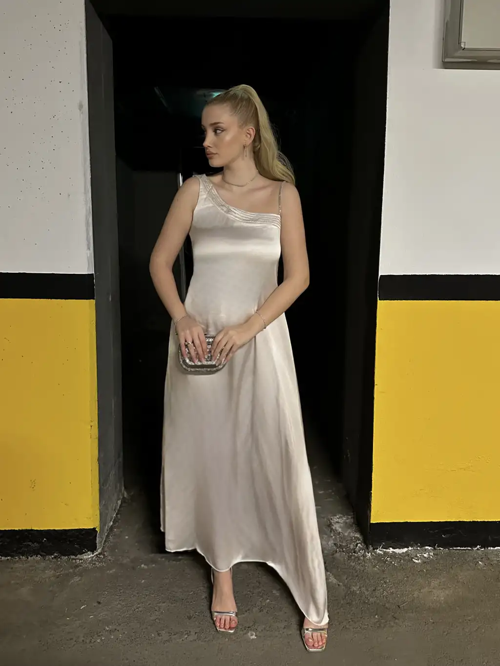 Lava Taş Detay Volanlı Saten Bej Elbise