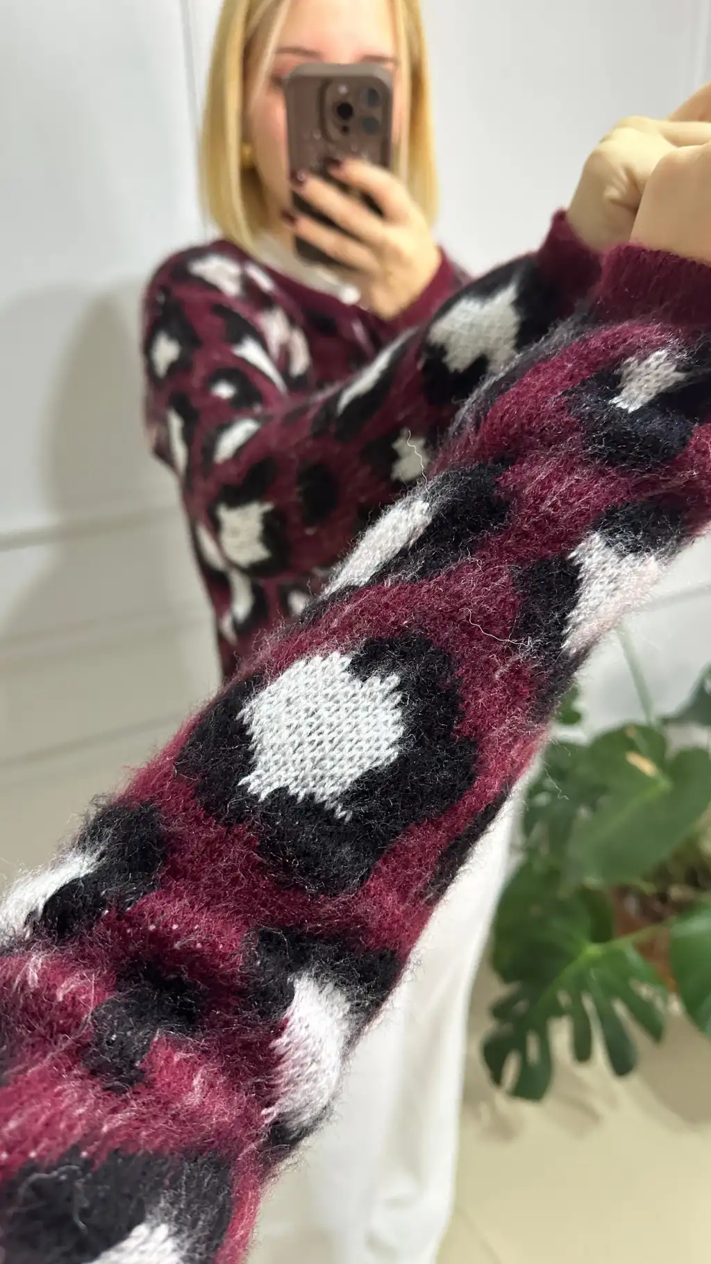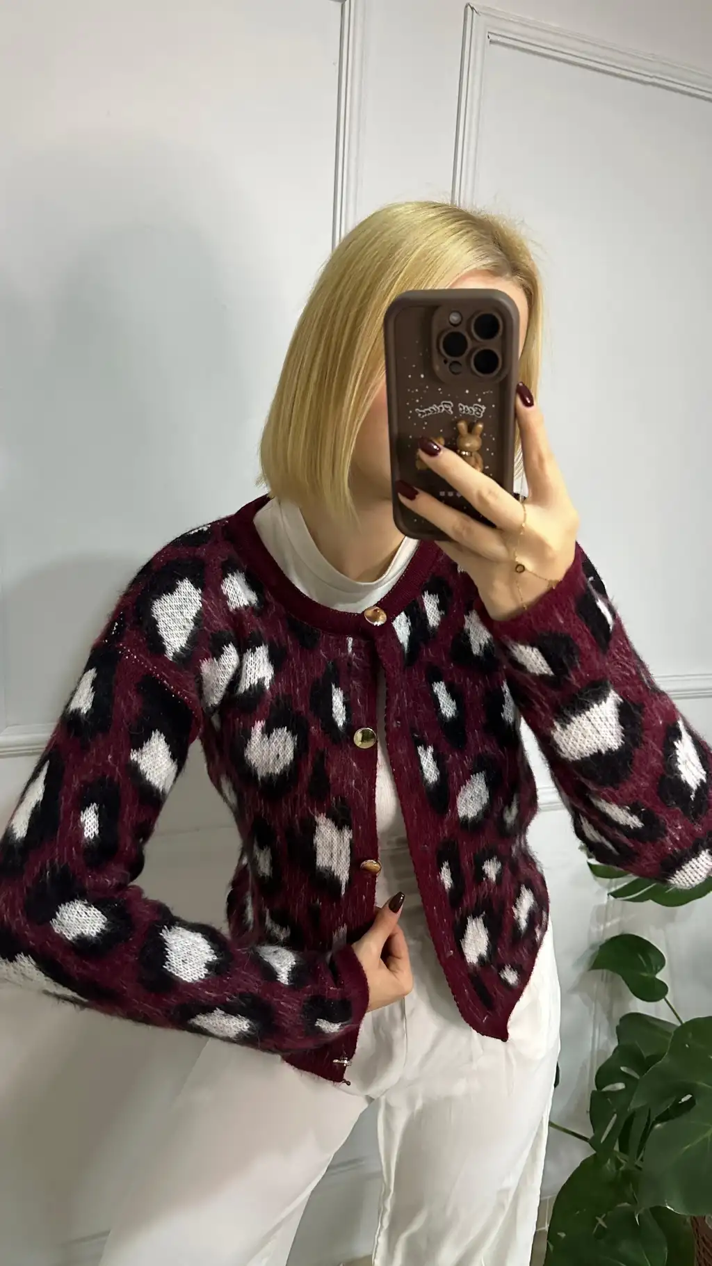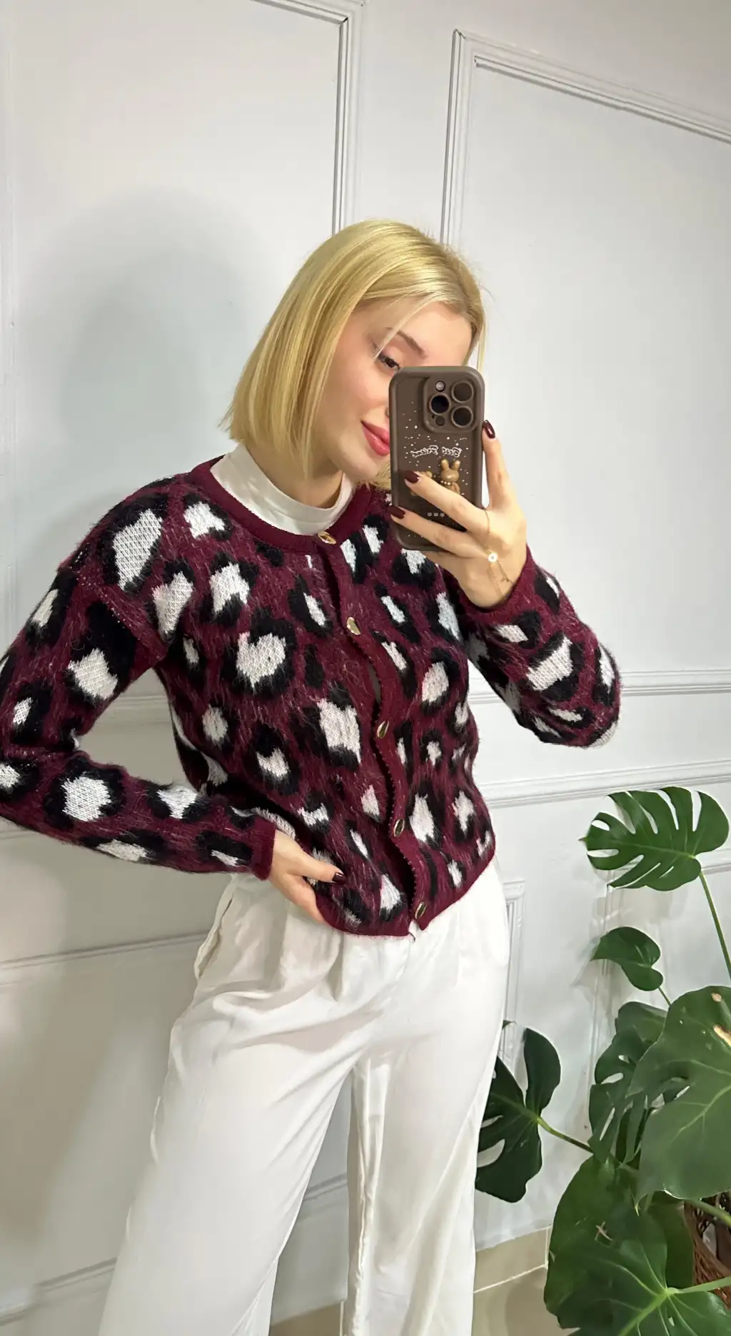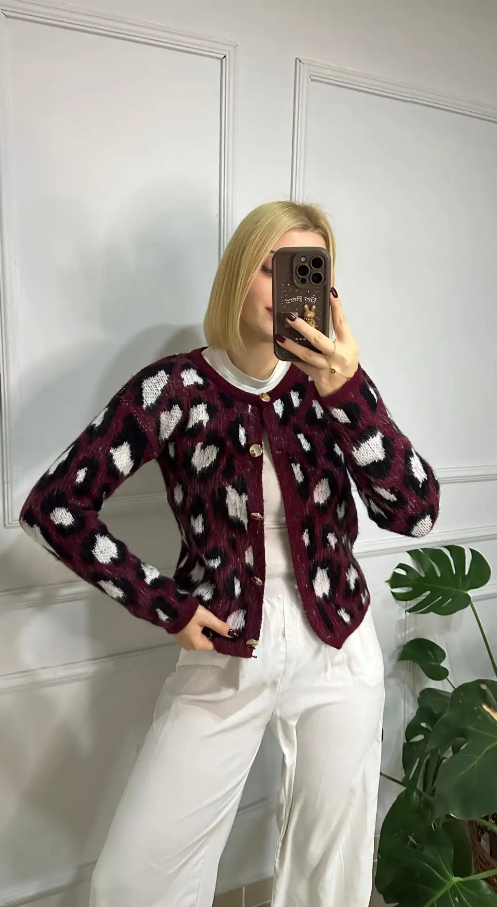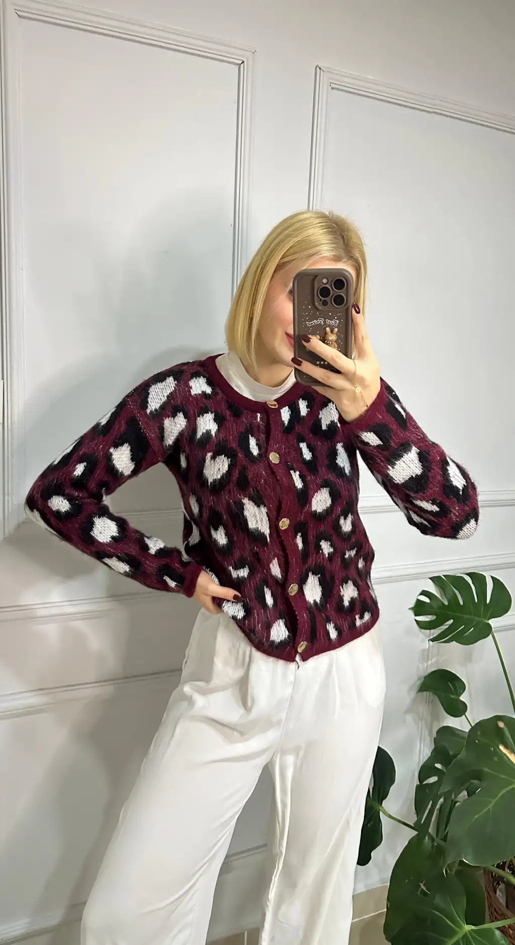 Lina Bordo Gold Düğmeli Leopar Yumoş Triko Hırka
