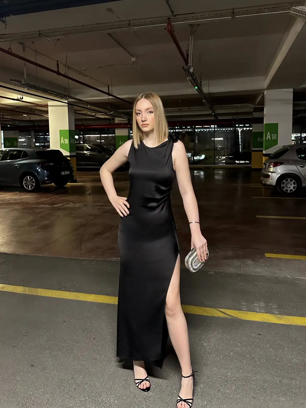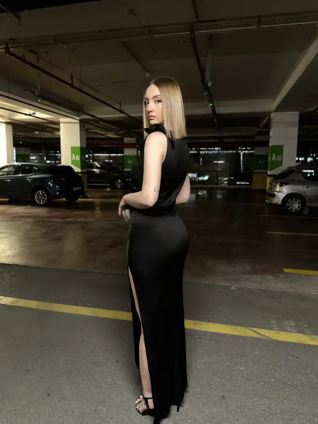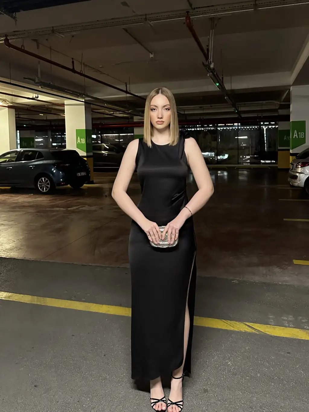Lina Omuz Bağlama Detay Uzun Siyah Saten Elbise