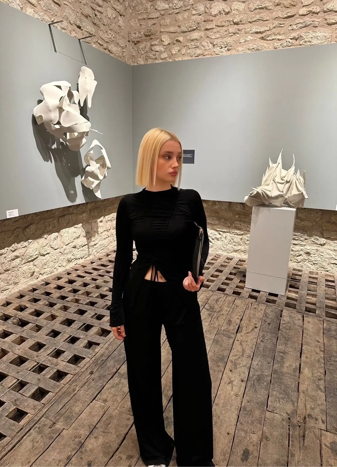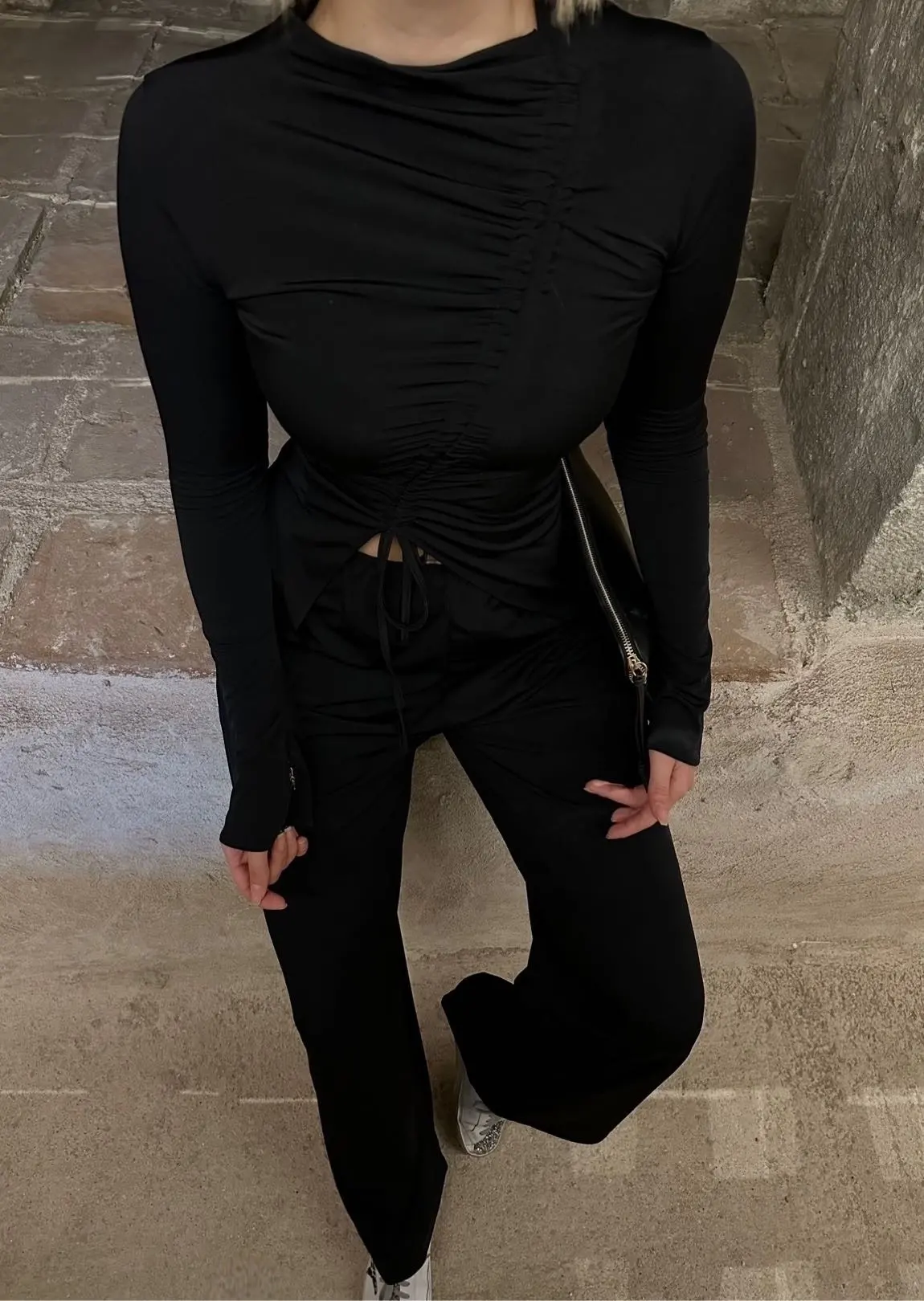 Ferina Siyah Muslin Ön Bağlamalı Kimono Takım