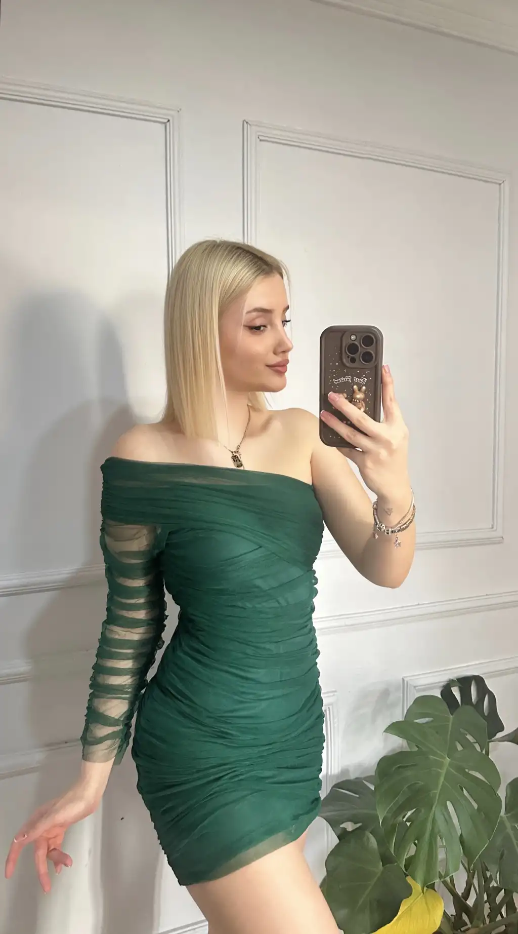 Madonna Zümrüt Yeşil Tek Kol Drapeli Kısa Tül Elbise