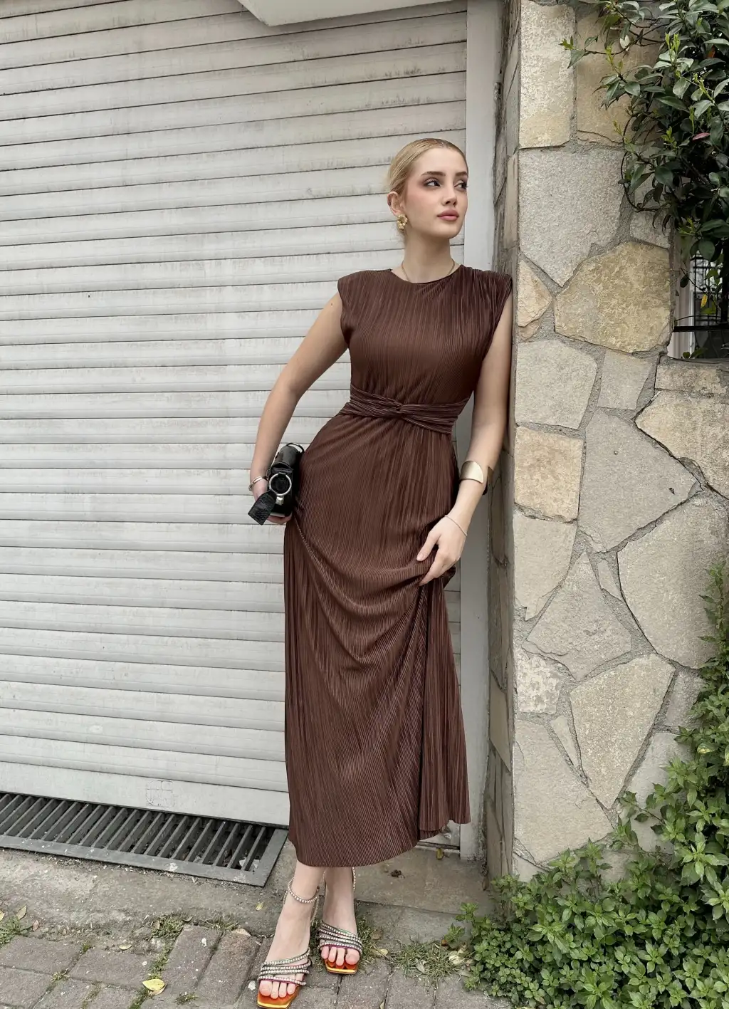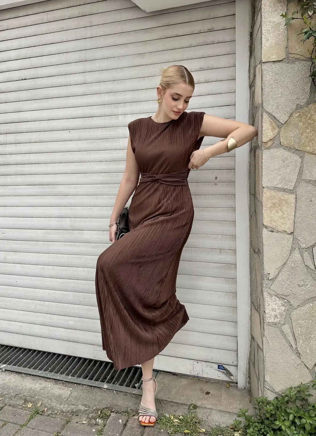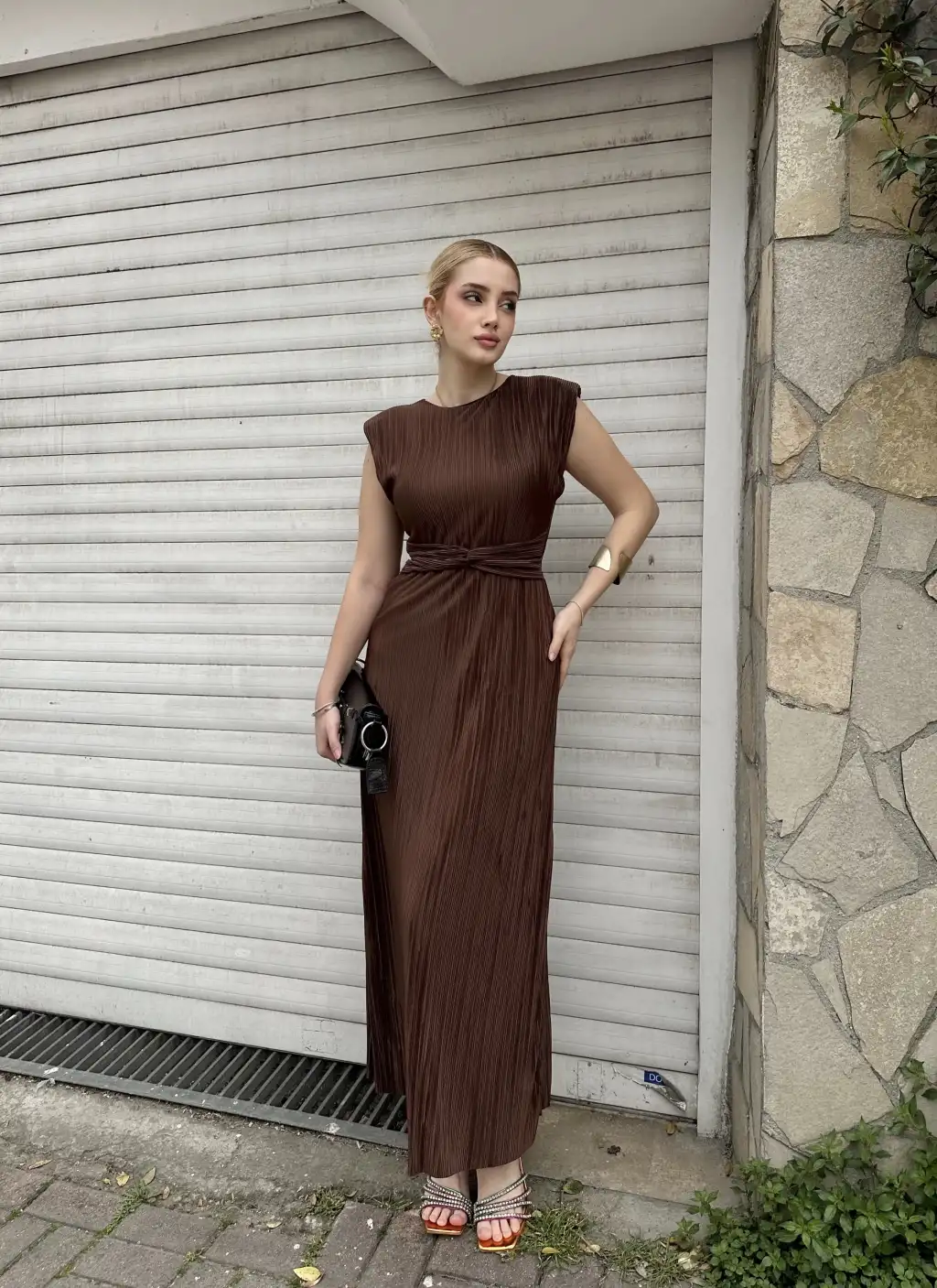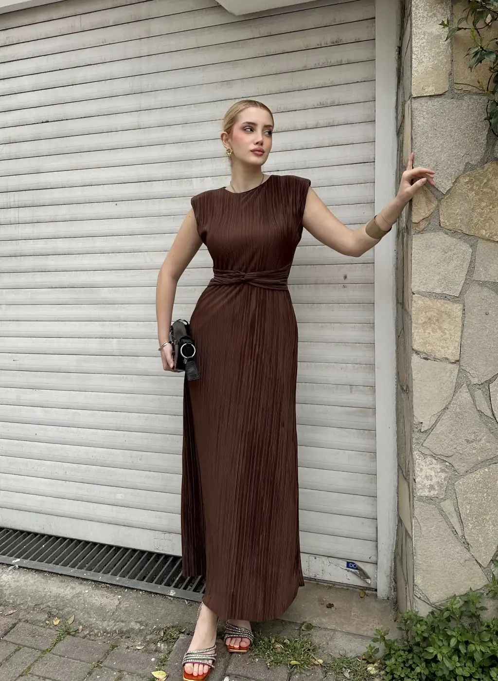 Melina Kahve Düğüm Detay Piliseli Elbise