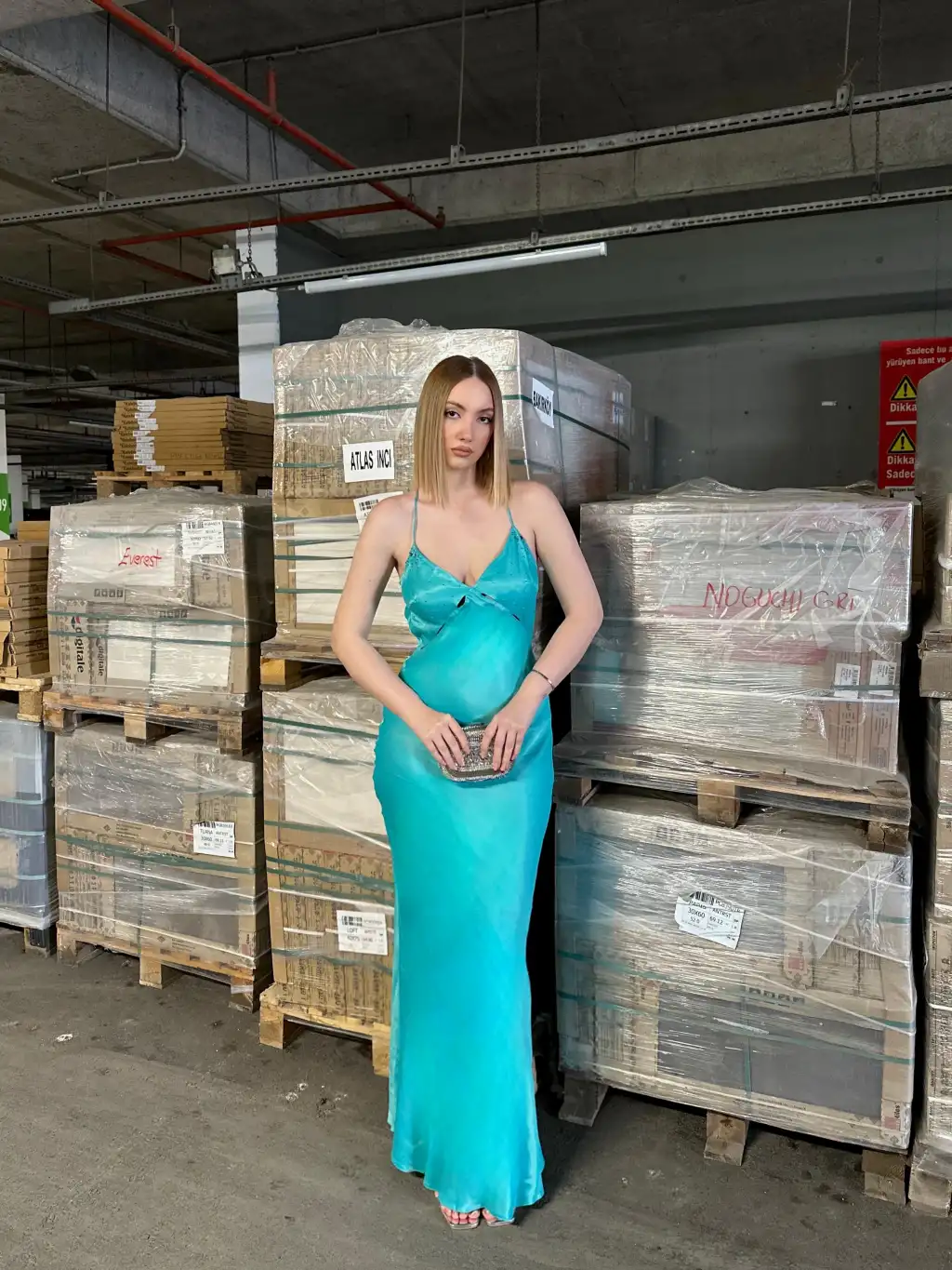 Moi Sırt Dekolteli V Yaka Balık Parlak Saten Abiye Mavi Elbise