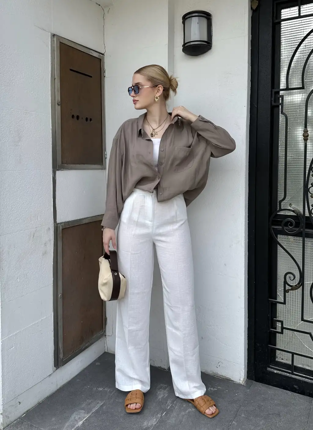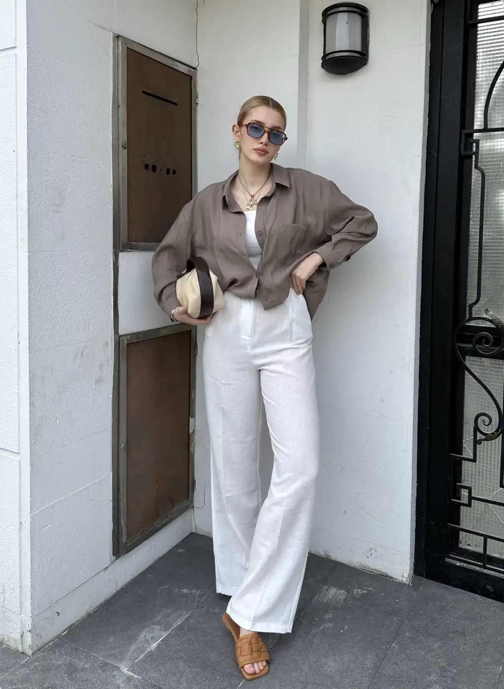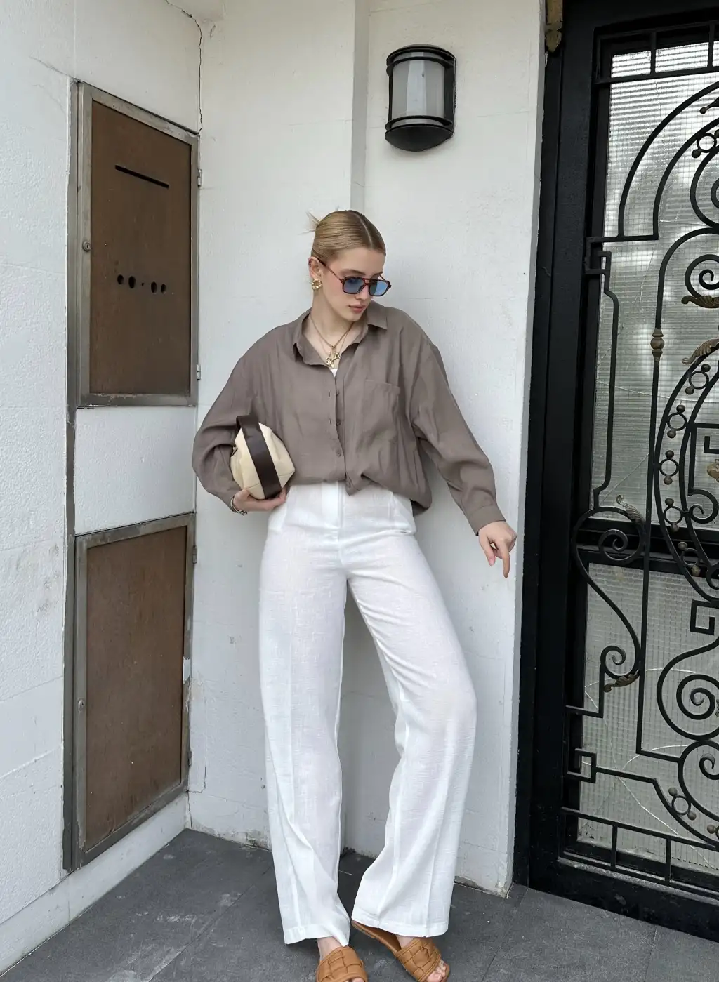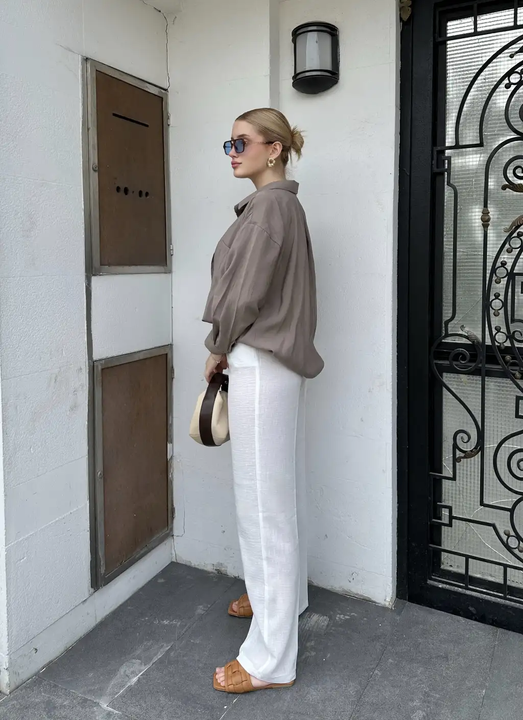 Pema Müslin Keten Düğmeli Beyaz Palazzo Pantolon