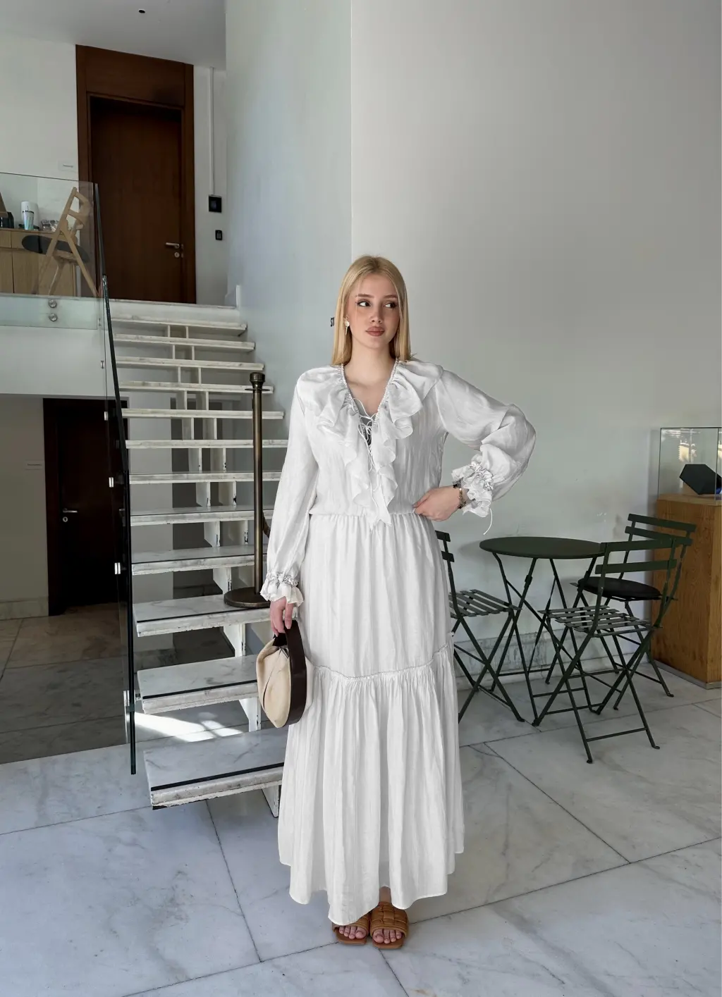 Olivette Kırık Beyaz Fırfırlı Premium Astarlı Tam Boy Elbise