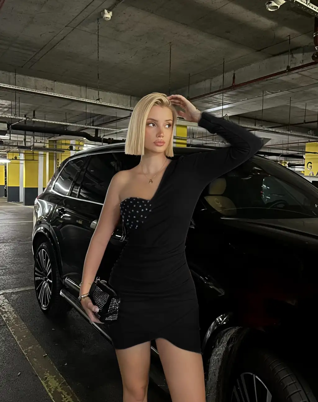Pera Siyah Gloplu Taşlı Tek Kol Elbise
