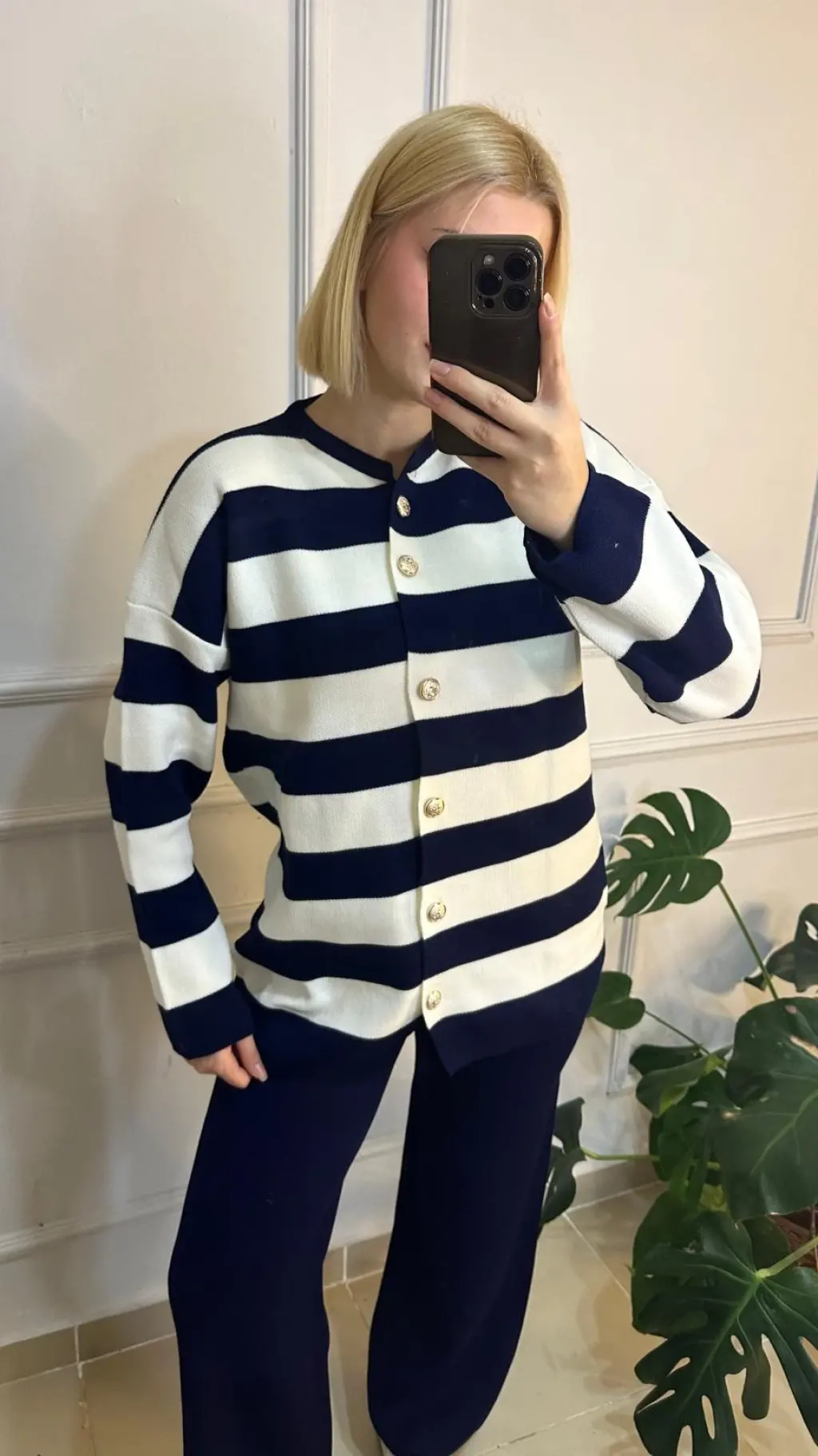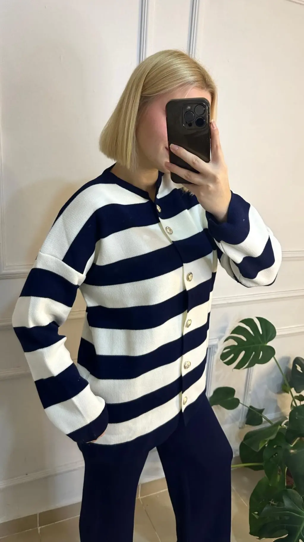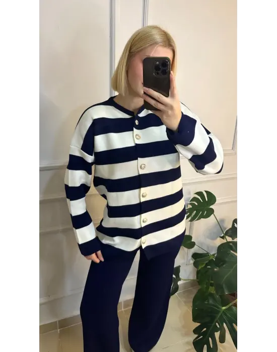 Perida Lacivert Gold Düğmeli Çizgili Hırka/Pantolon İkili Takım