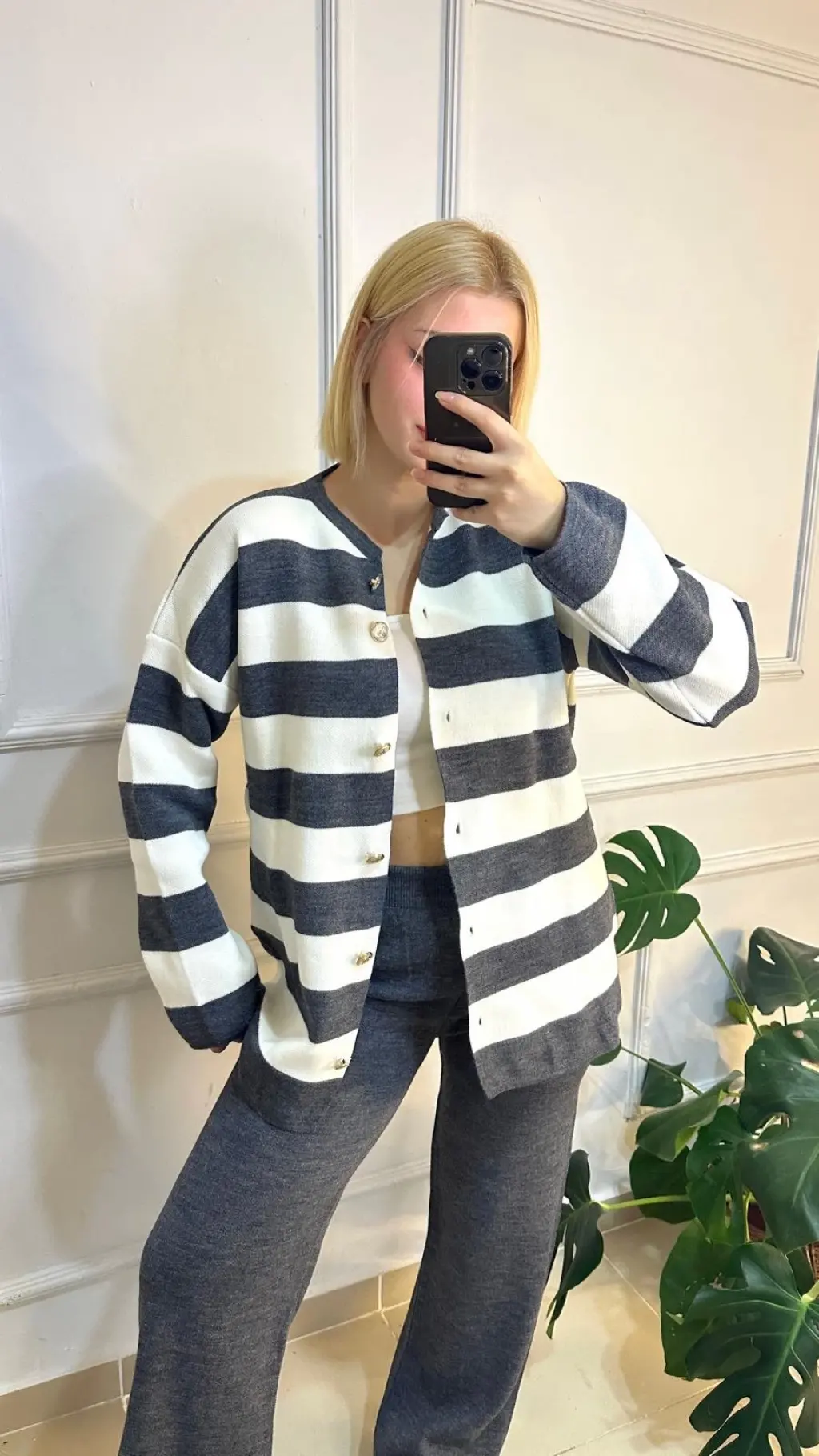 PERİDA GRİ GOLD DÜĞMELİ ÇİZGİLİ HIRKA/PANTOLON İKİLİ TAKIM