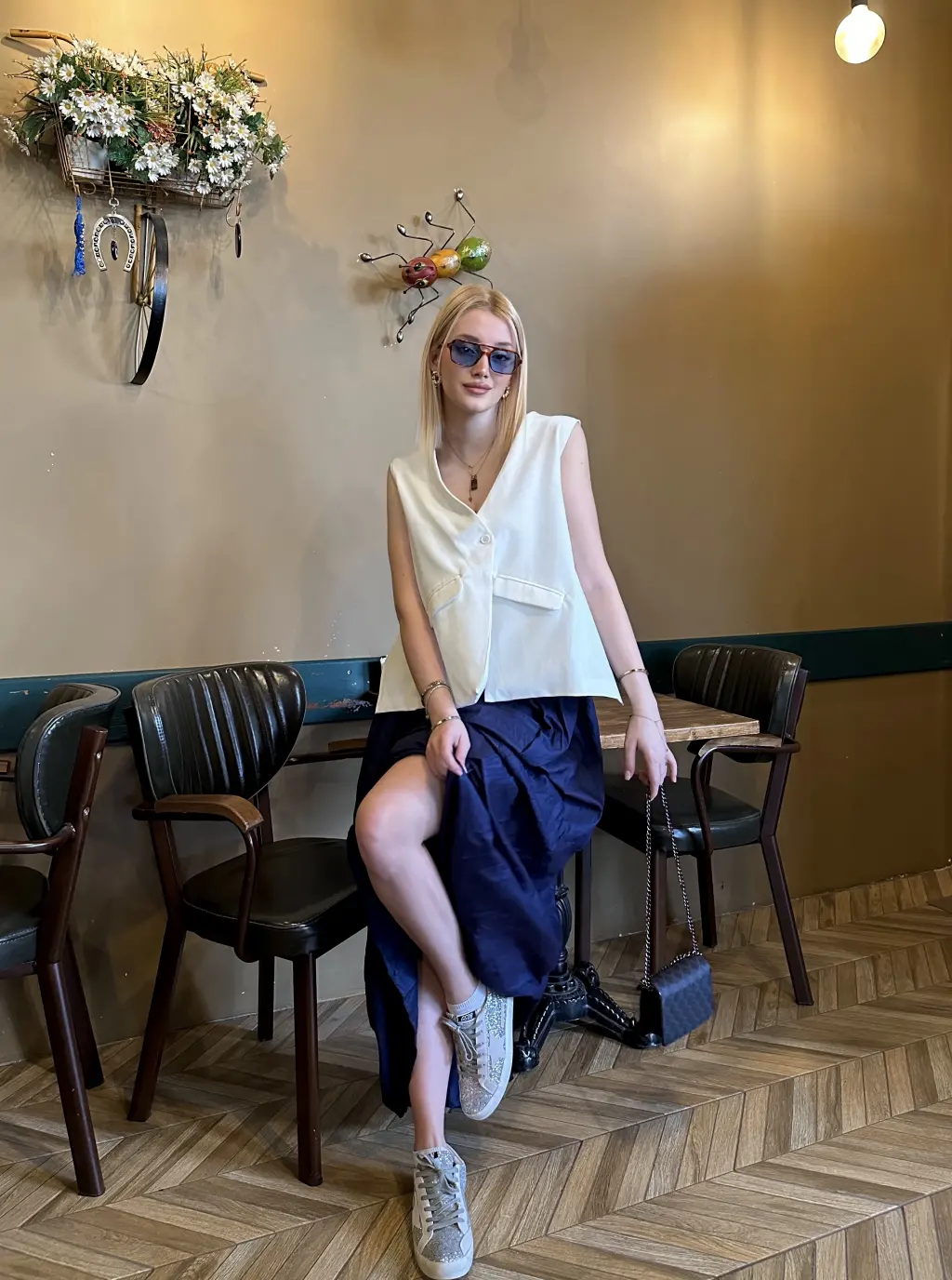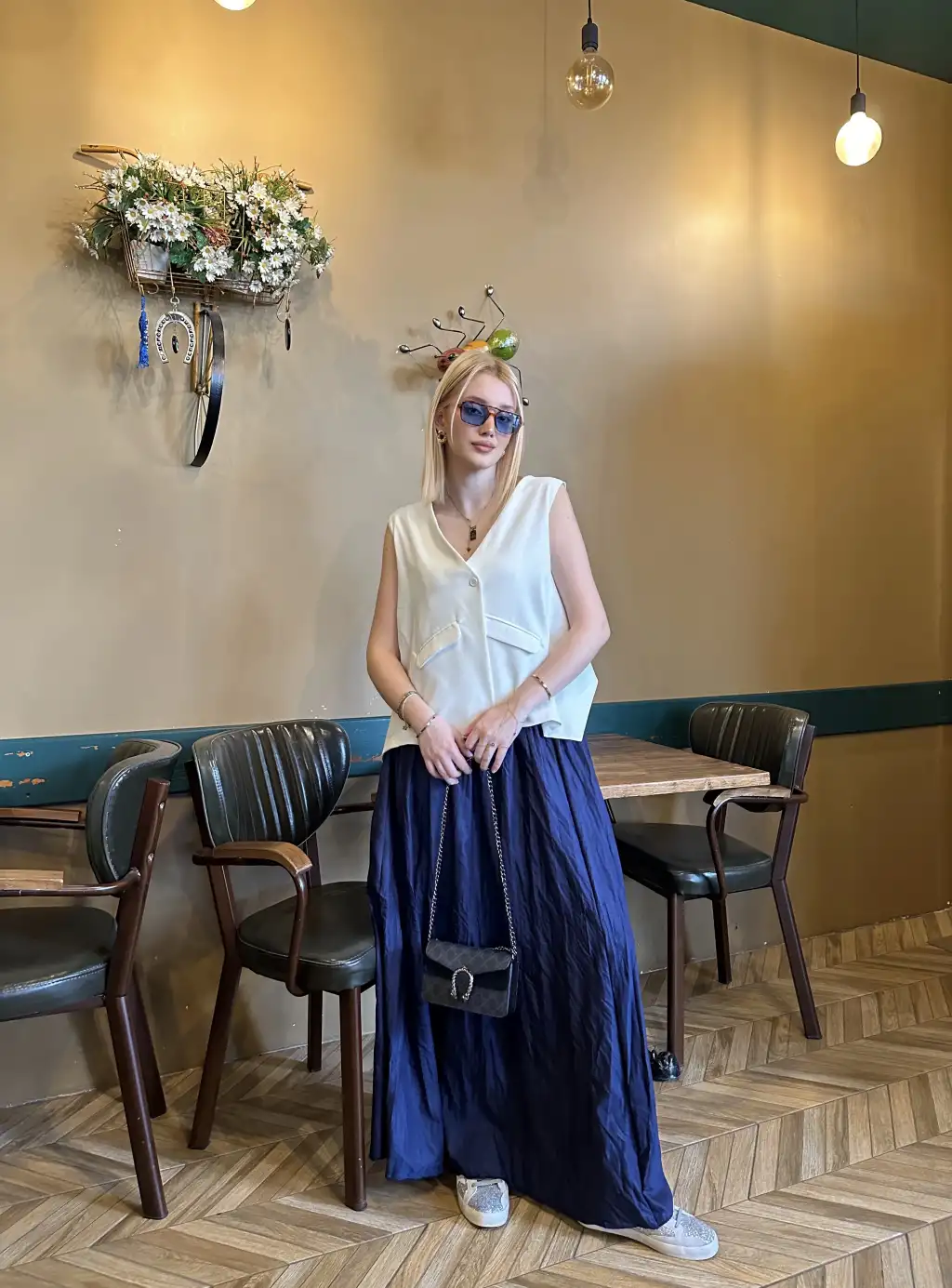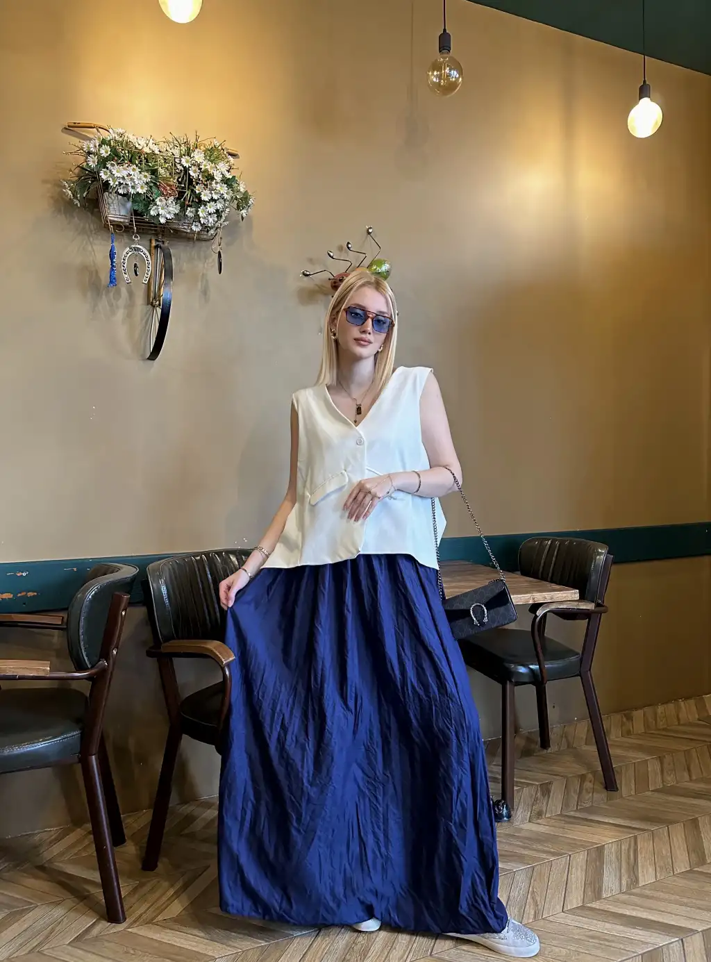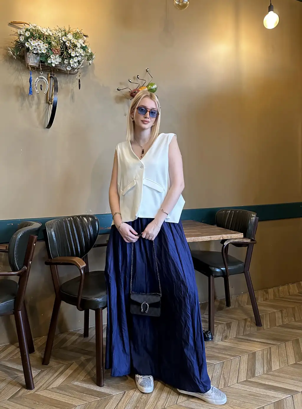Polene Lacivert Crush Maxi Boy Uzun Etek