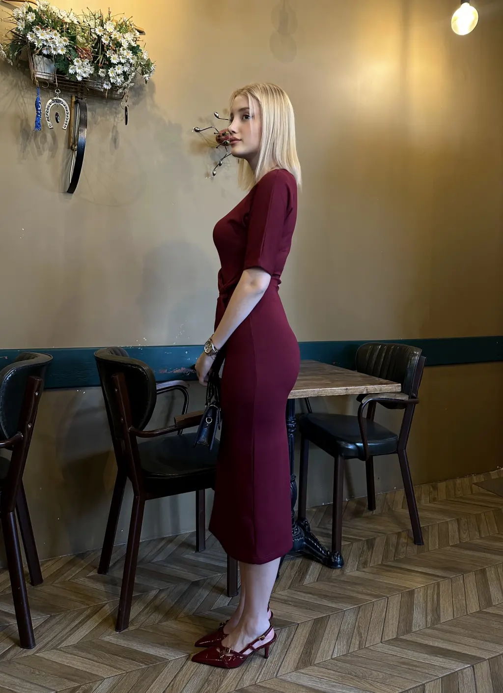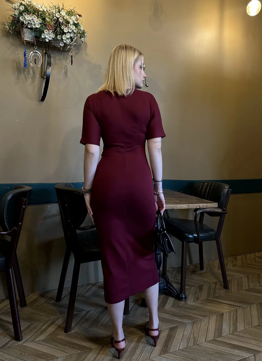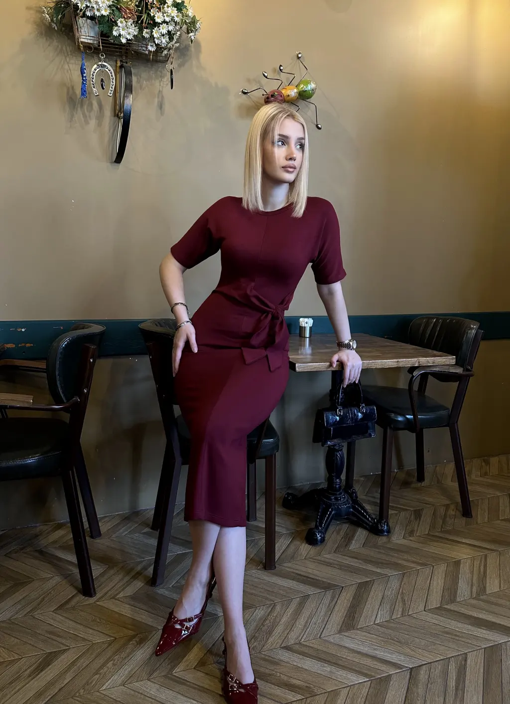 Roselin Bordo Belden Bağlamalı Midi Boy Esnek Elbise