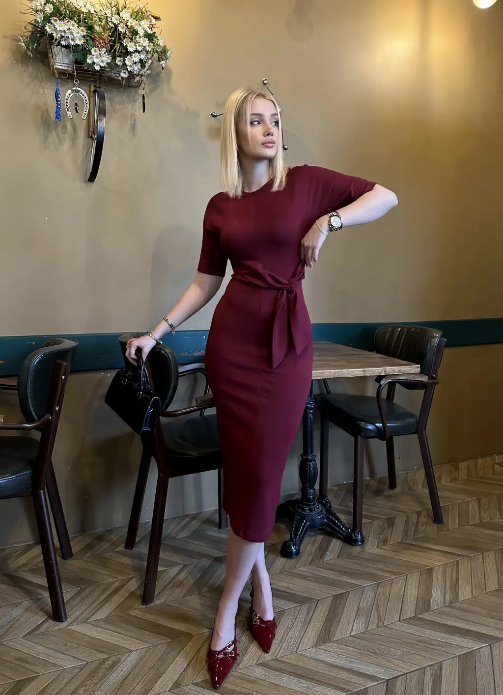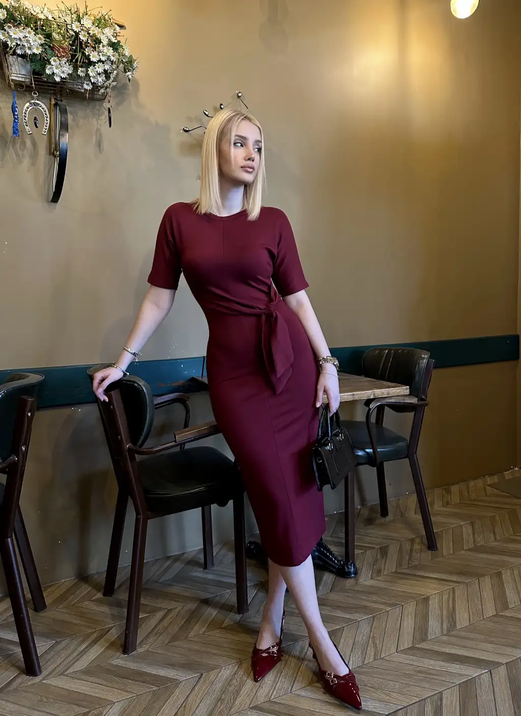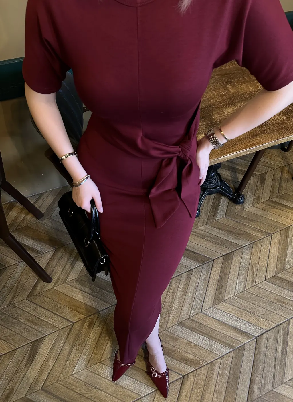 Roselin Bordo Belden Bağlamalı Midi Boy Esnek Elbise