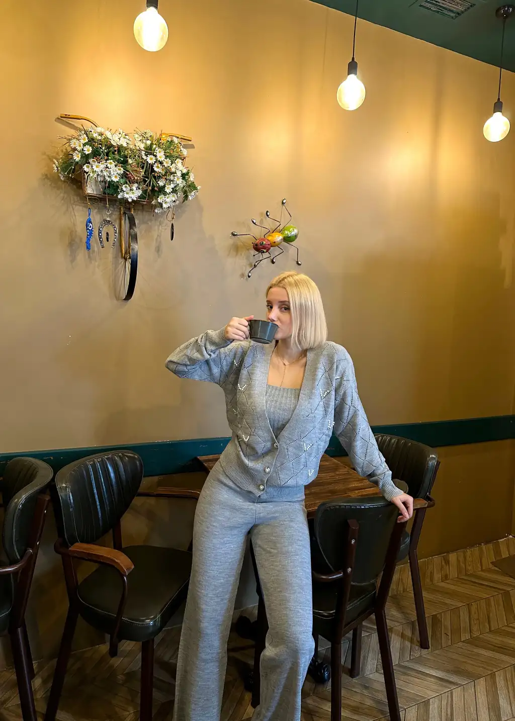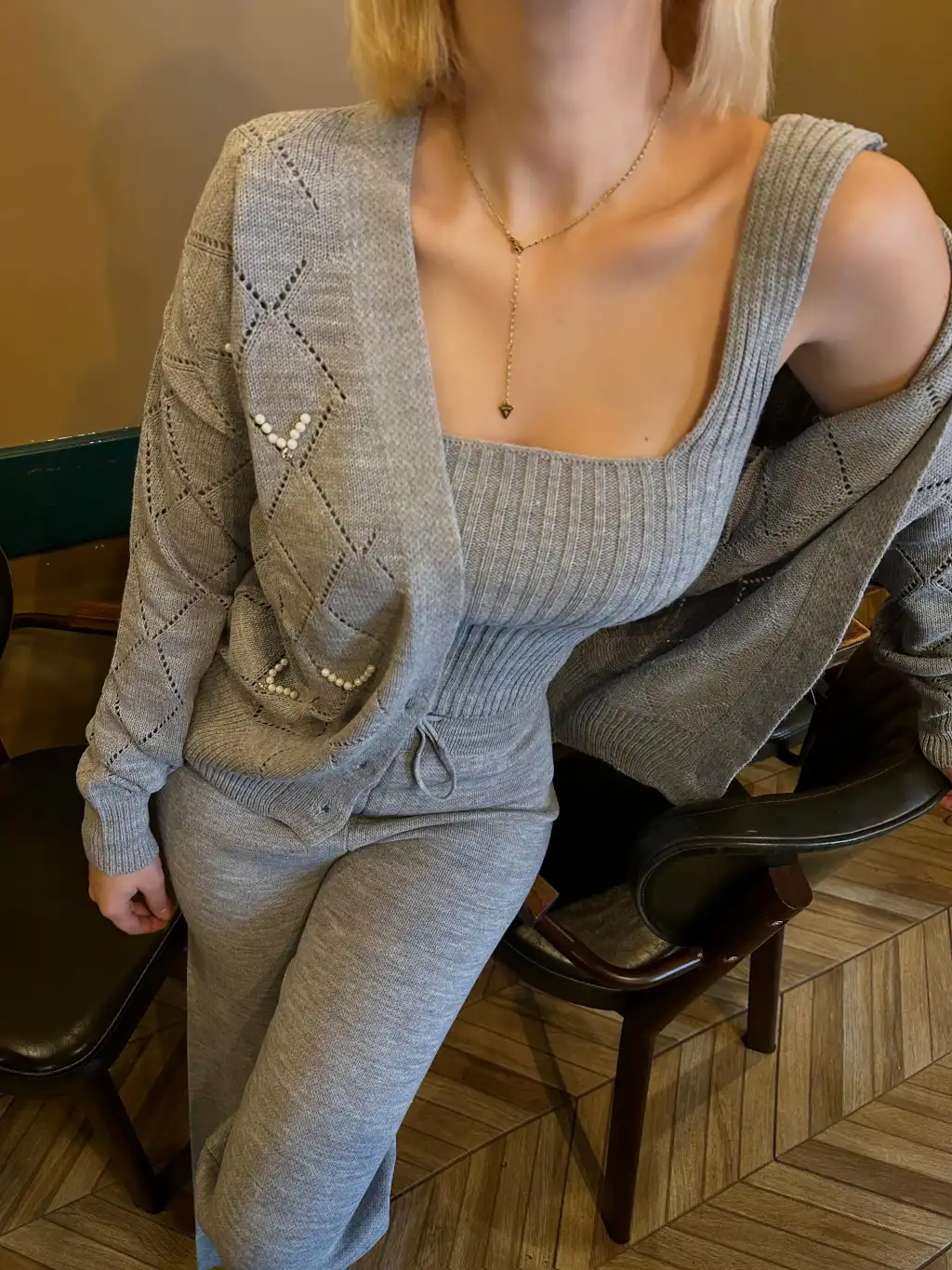 Sally Gri İncili 3'lü Triko Takım