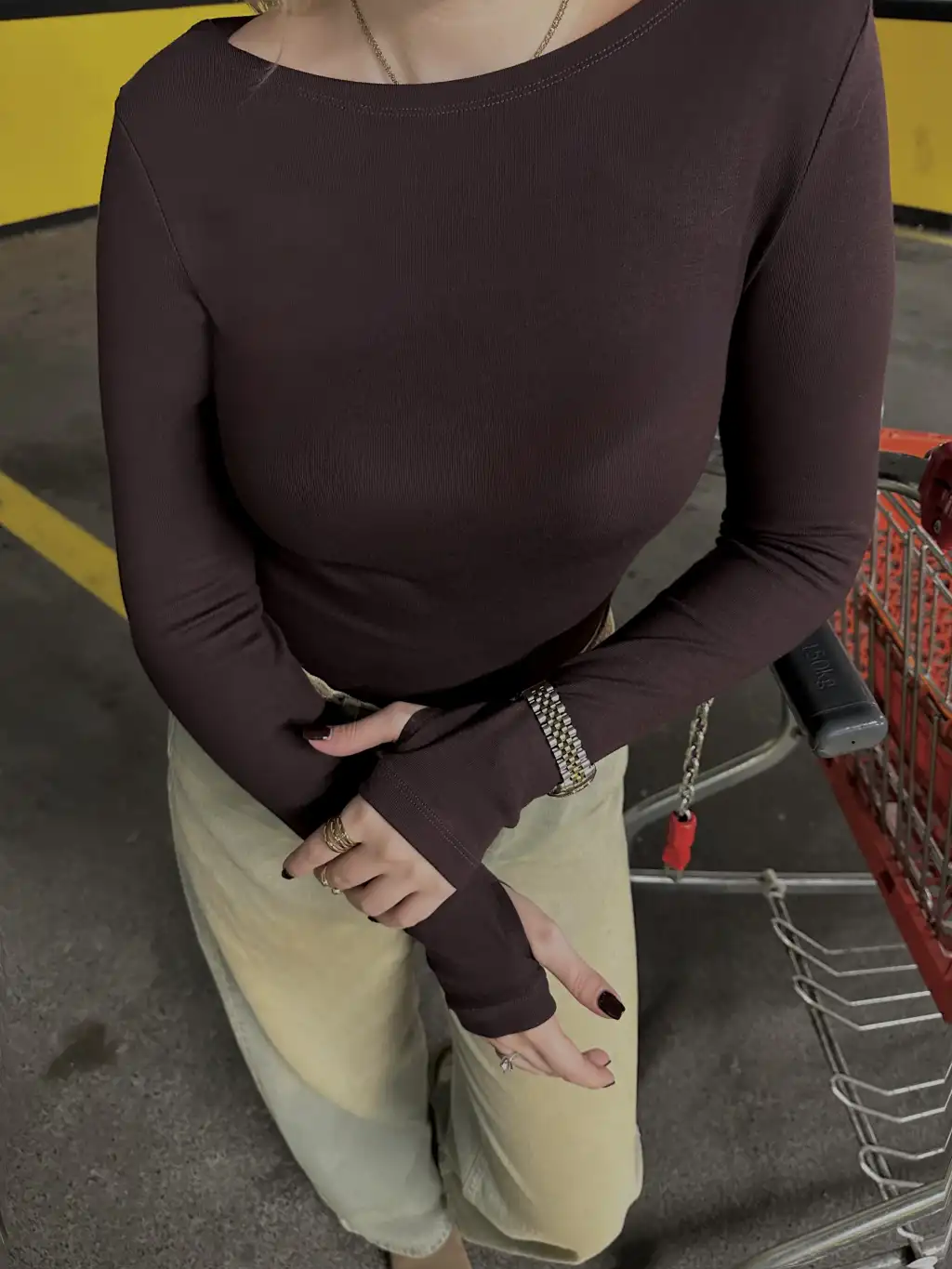 Kahve Kayık Yaka Parmak Geçmeli Bluz