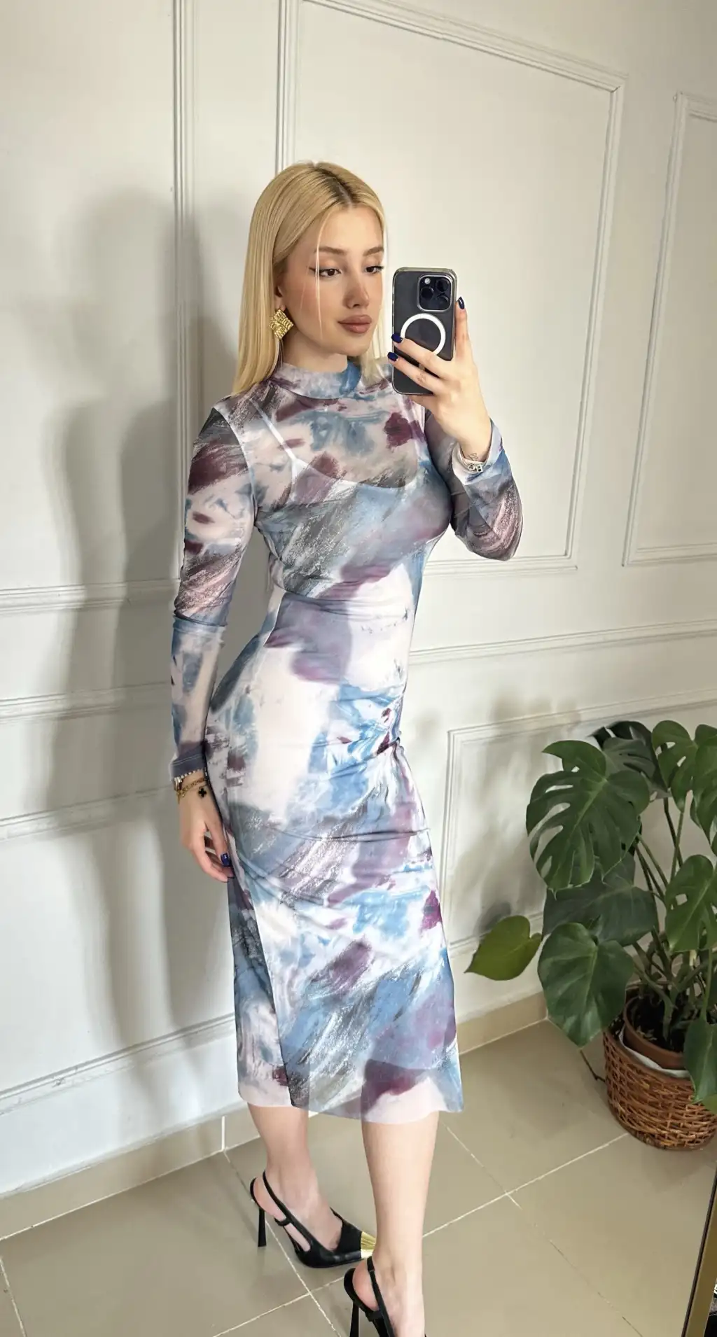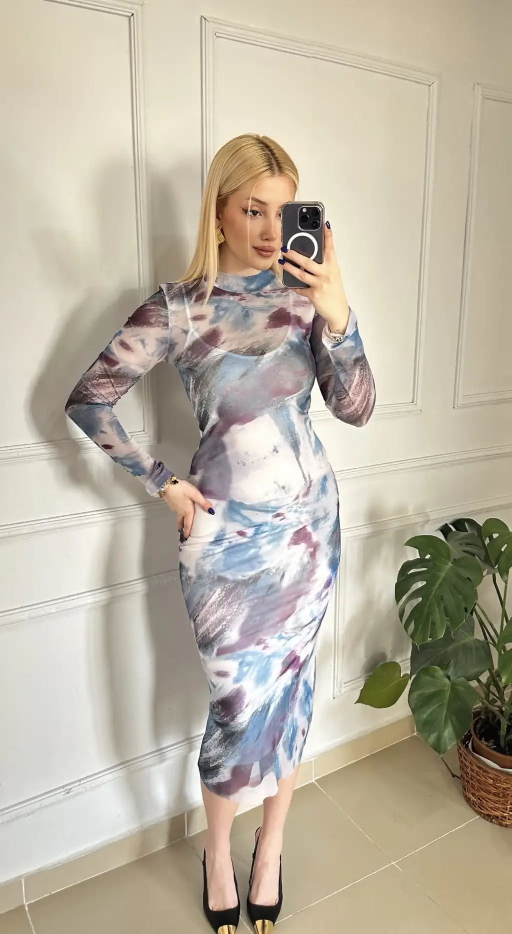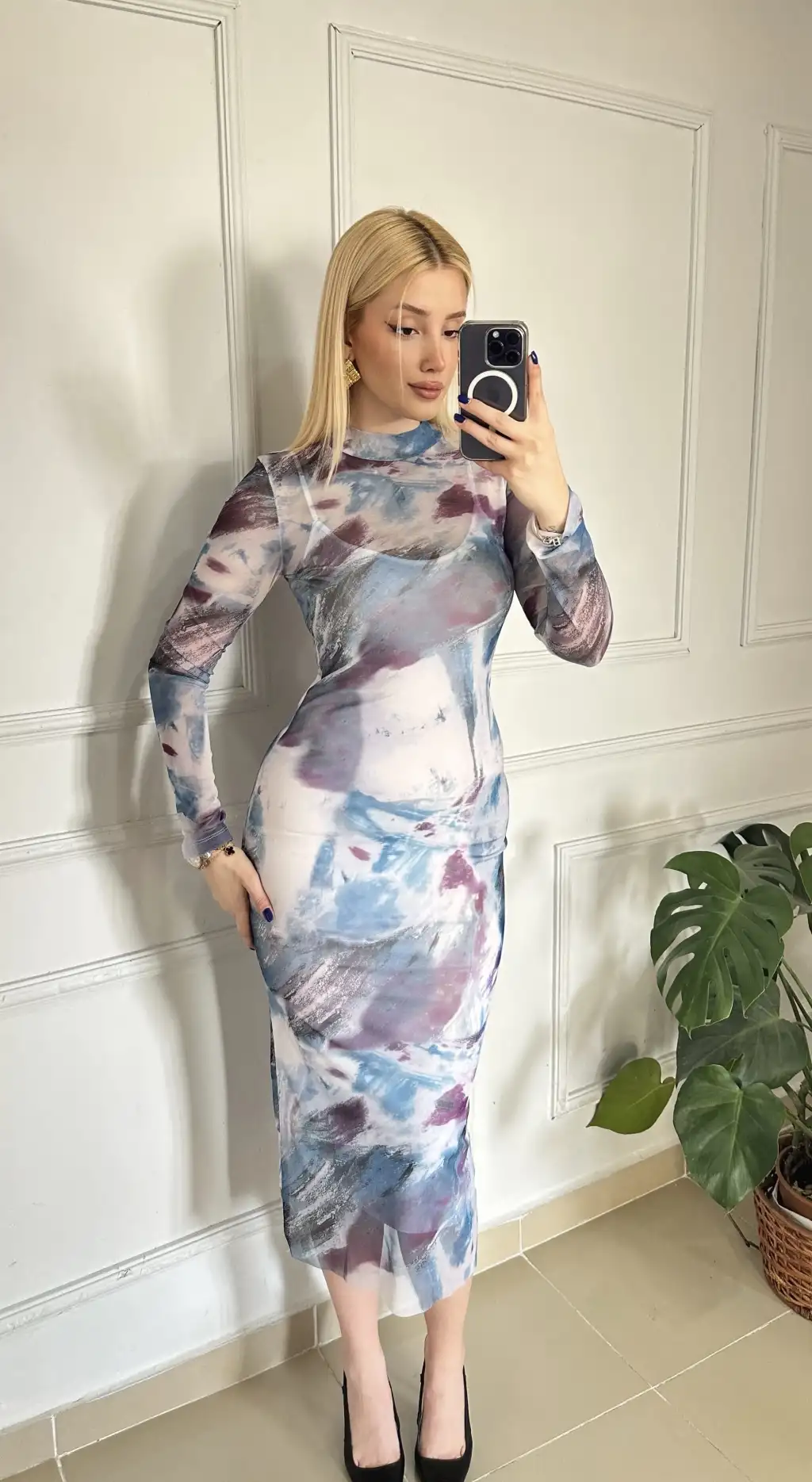 Solwe Desenli Tül Midi Boy Elbise