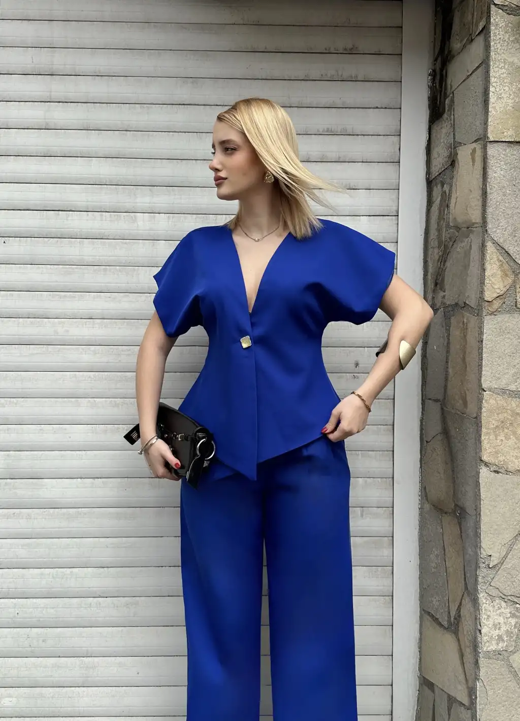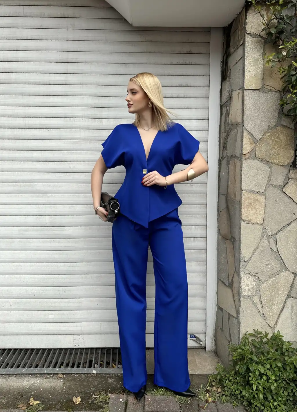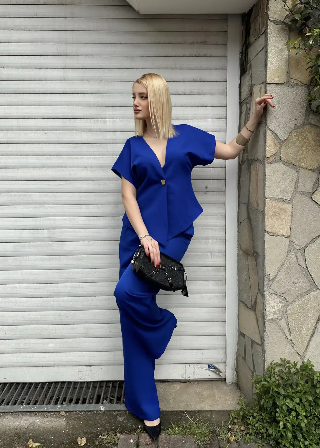 Valera Saks Mavi Yarasa Kol Tek Düğme Astarlı Blazer Pantolon Takım