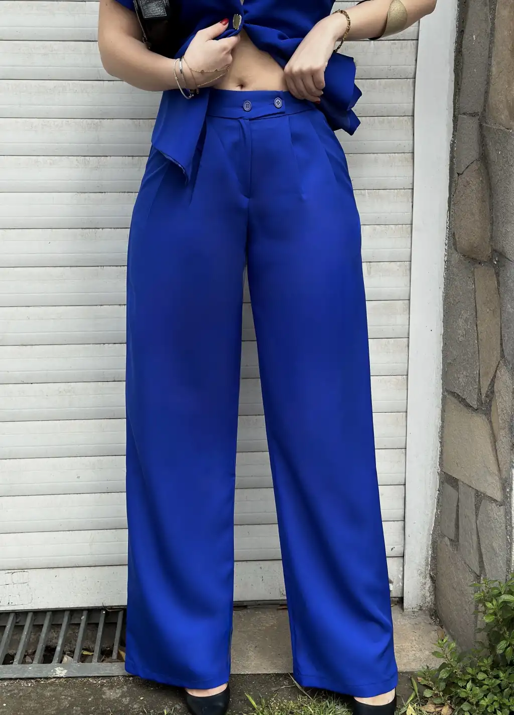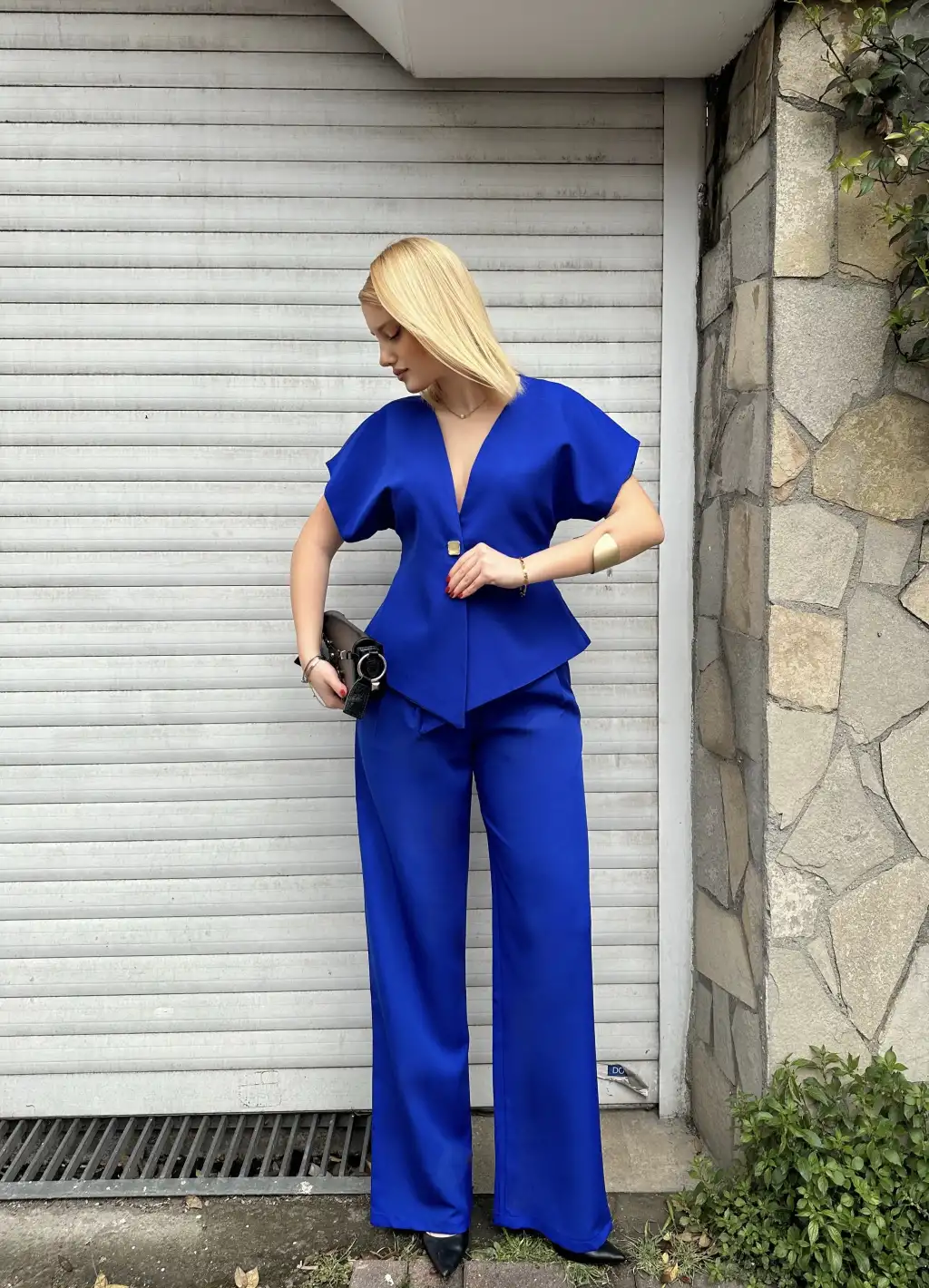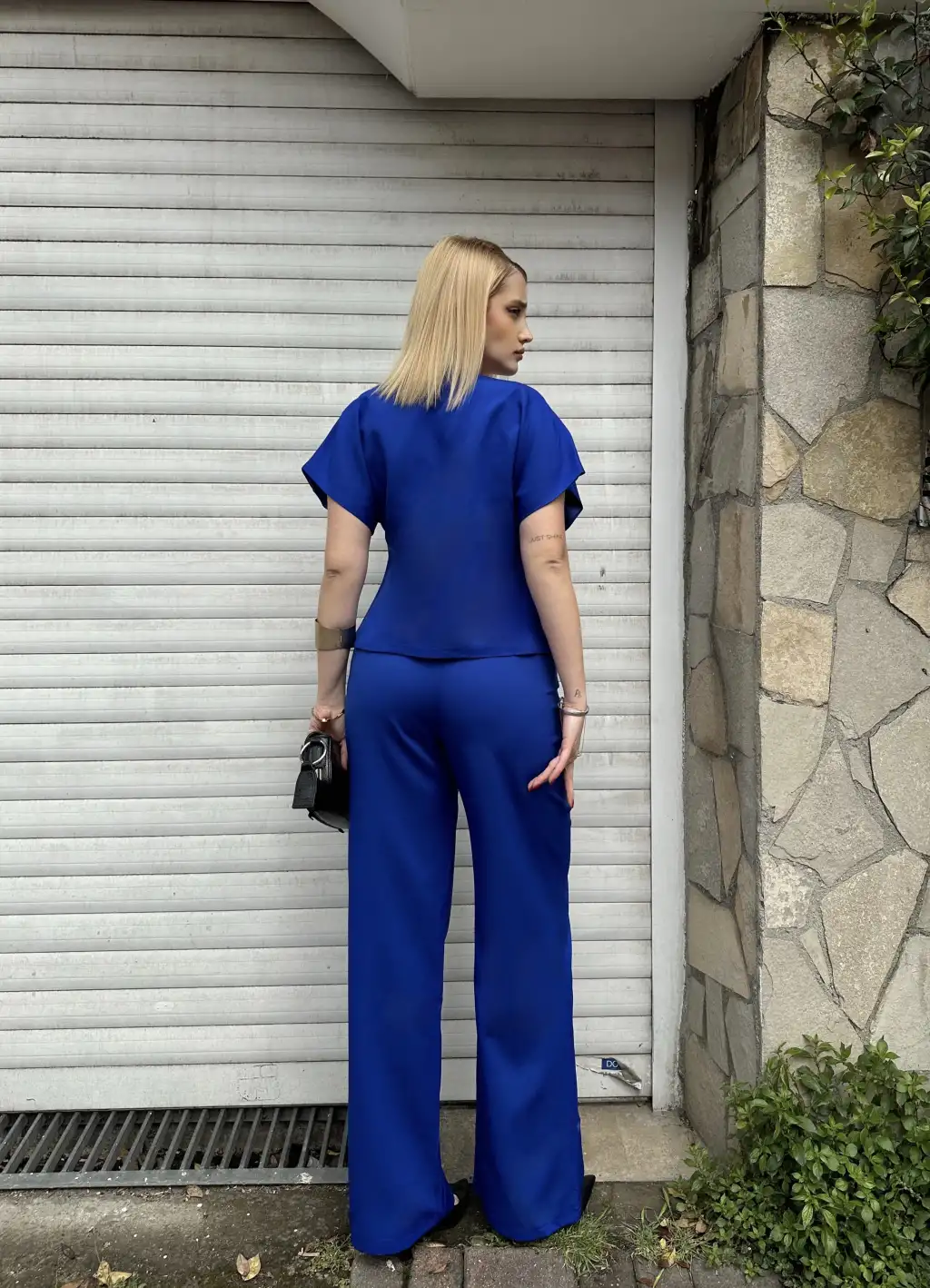 Valera Saks Mavi Yarasa Kol Tek Düğme Astarlı Blazer Pantolon Takım