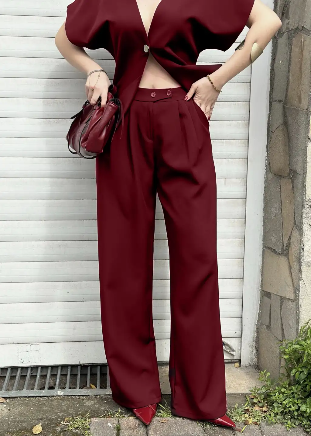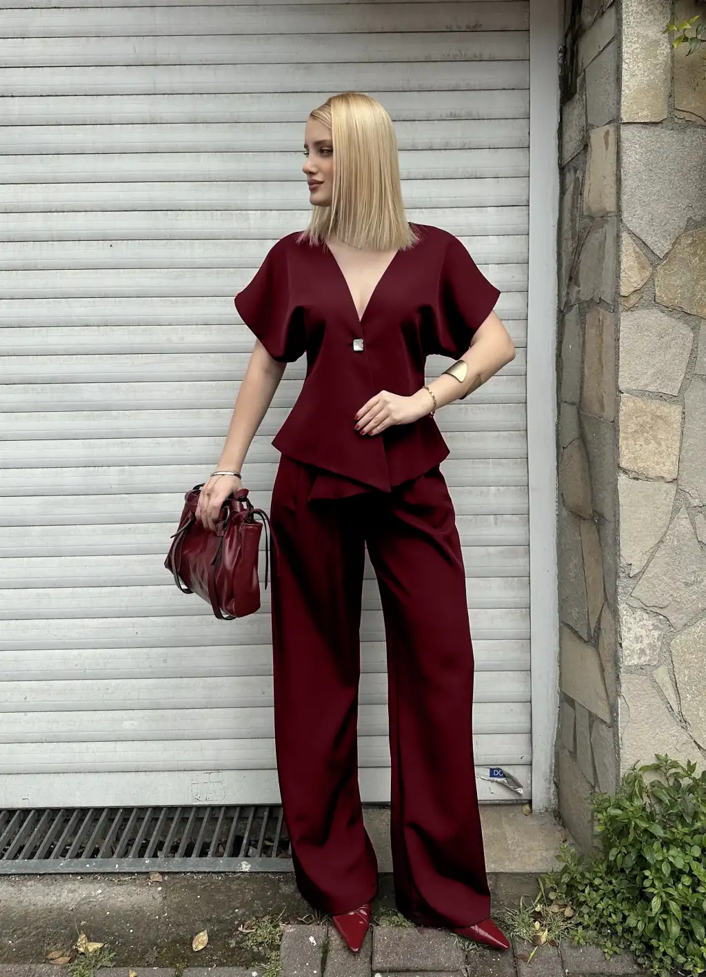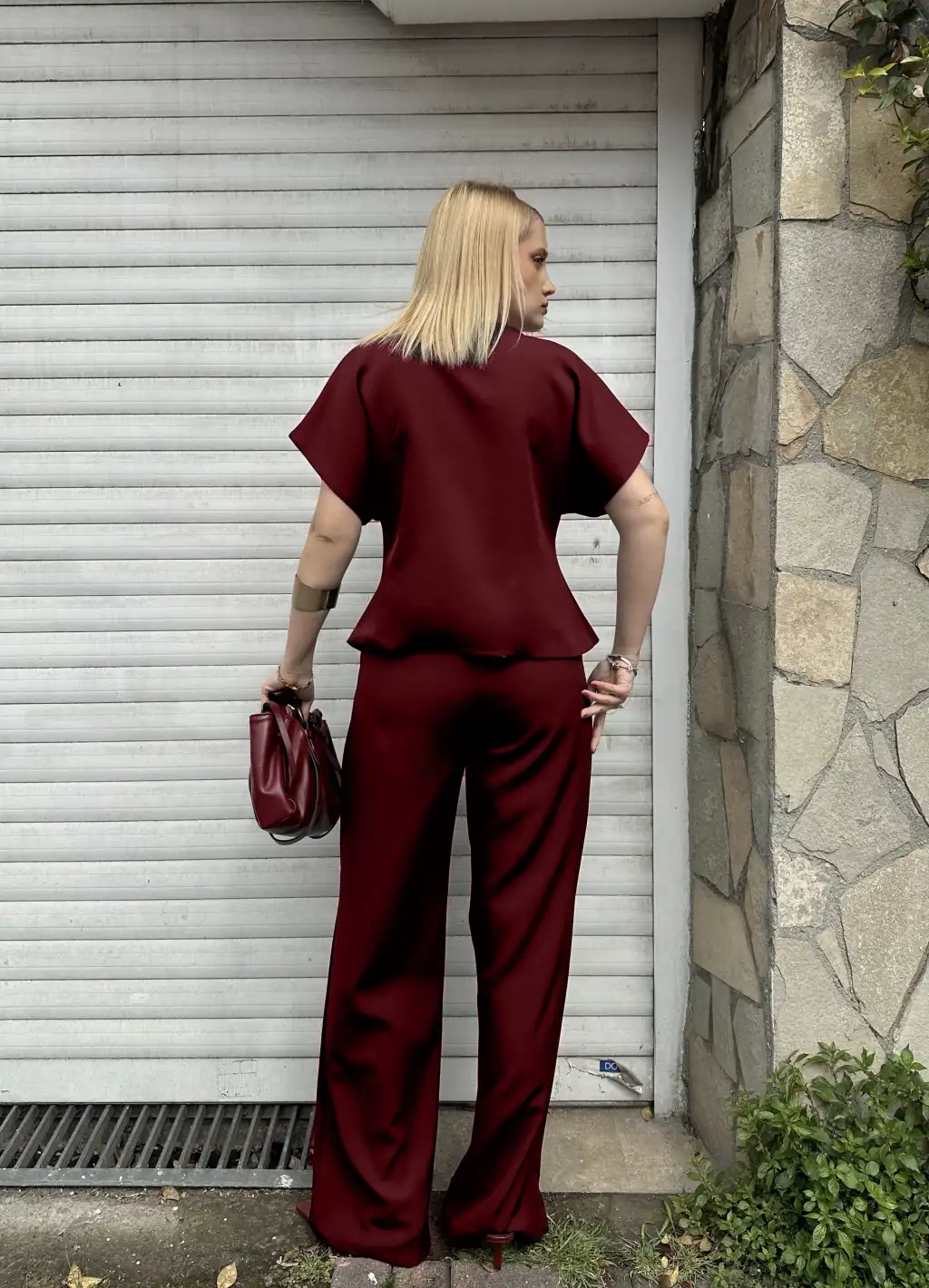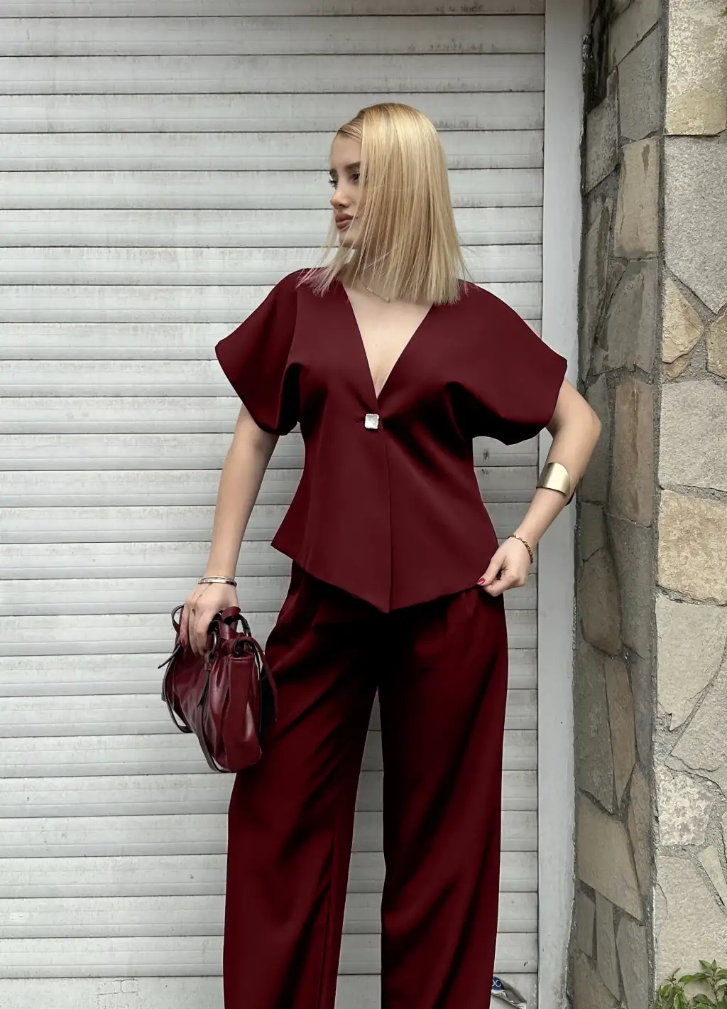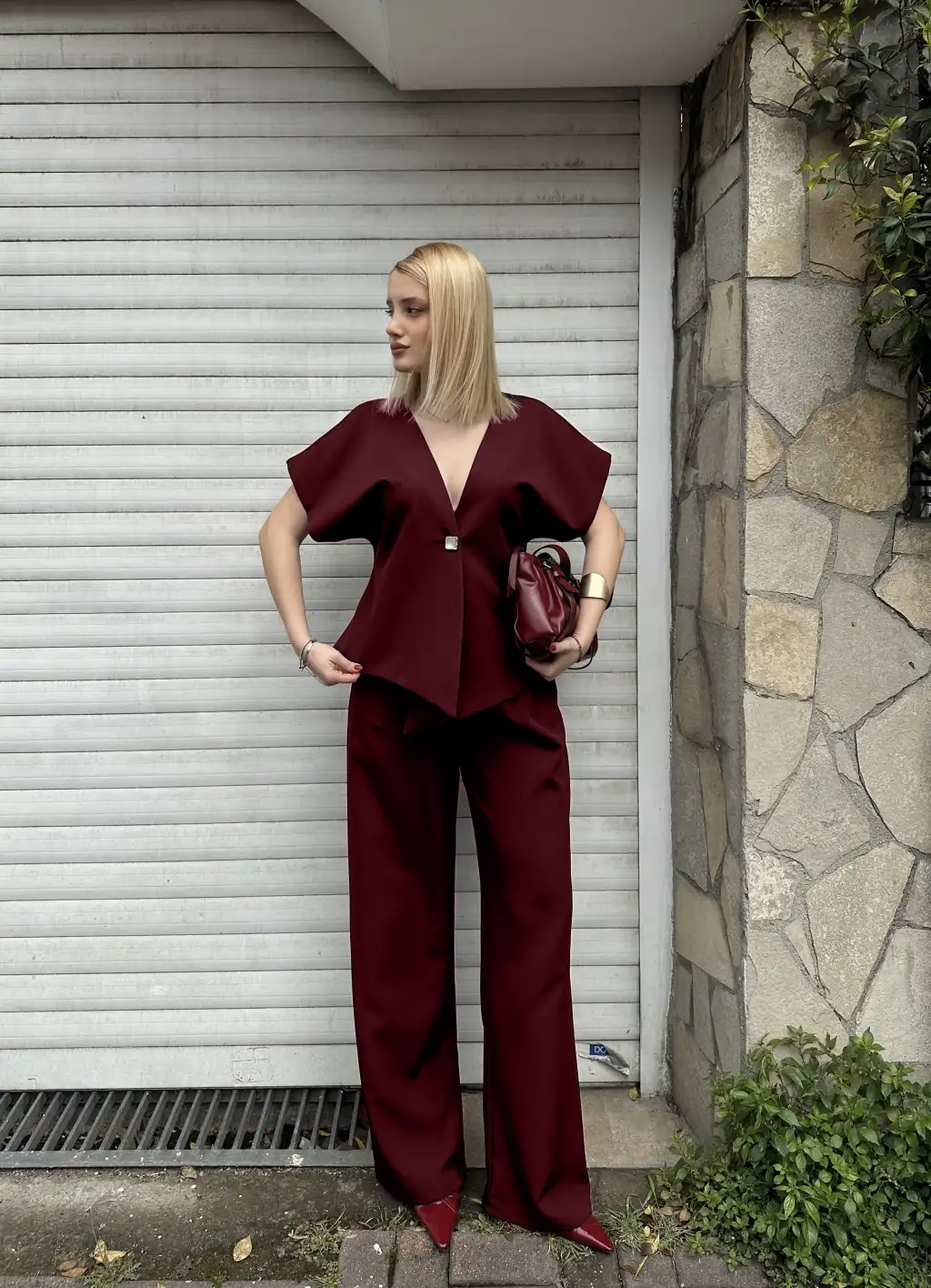 Valera Bordo Yarasa Kol Tek Düğme Astarlı Blazer Pantolon Takım