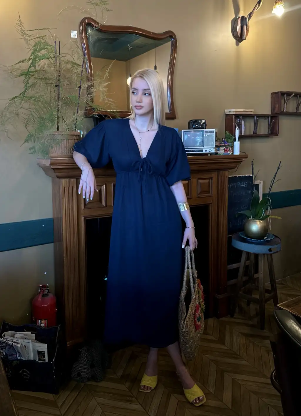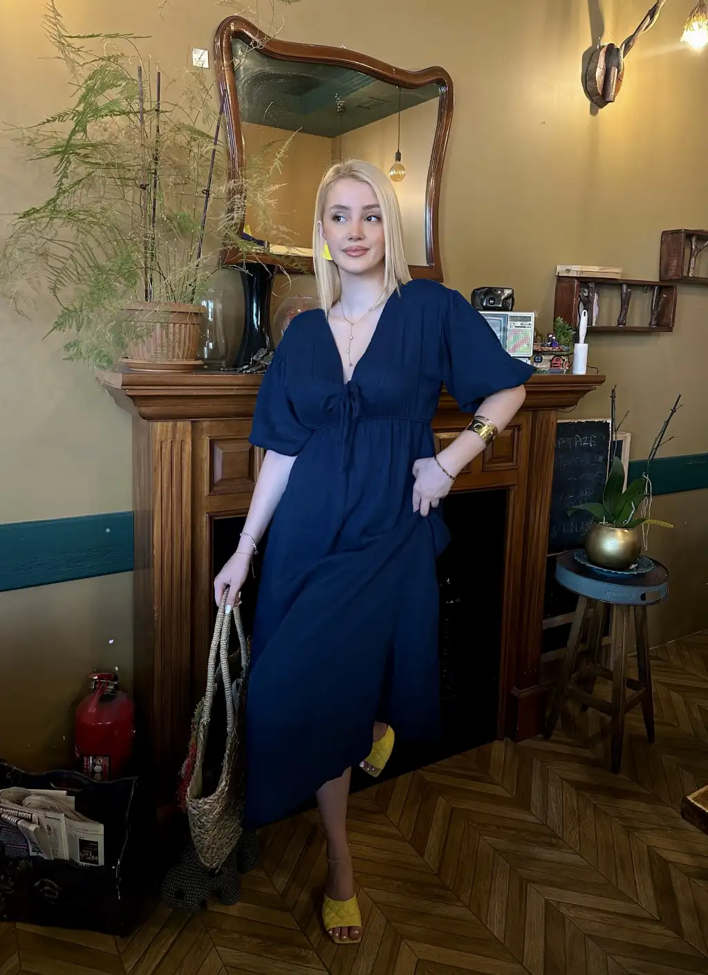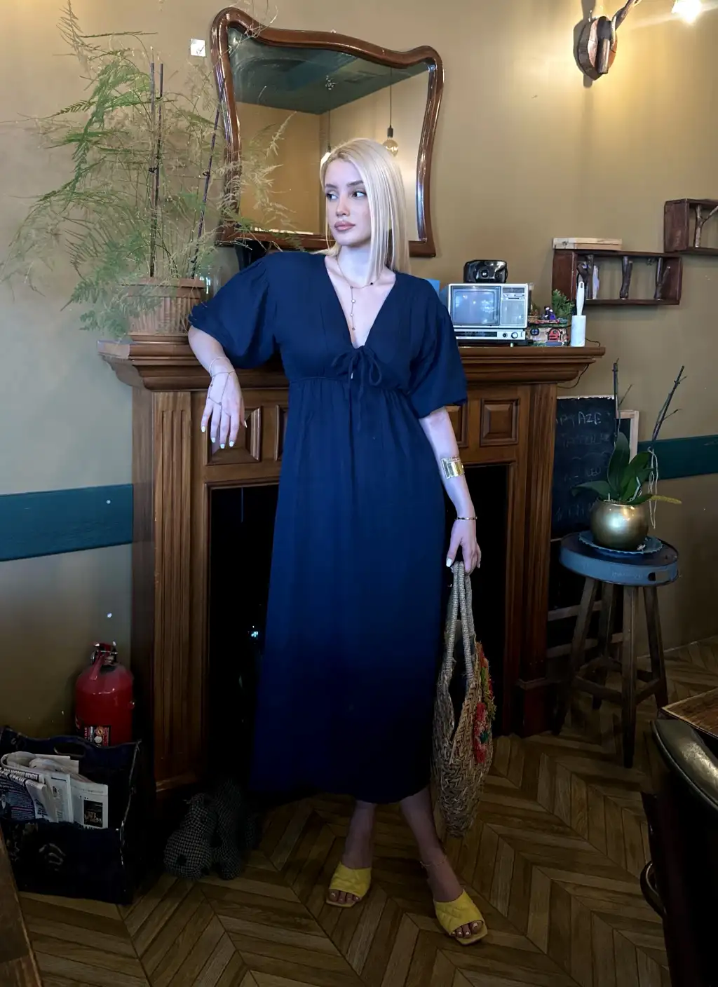 Vayla Lacivert Müslin Kumaş Bağlama Detaylı Elbise