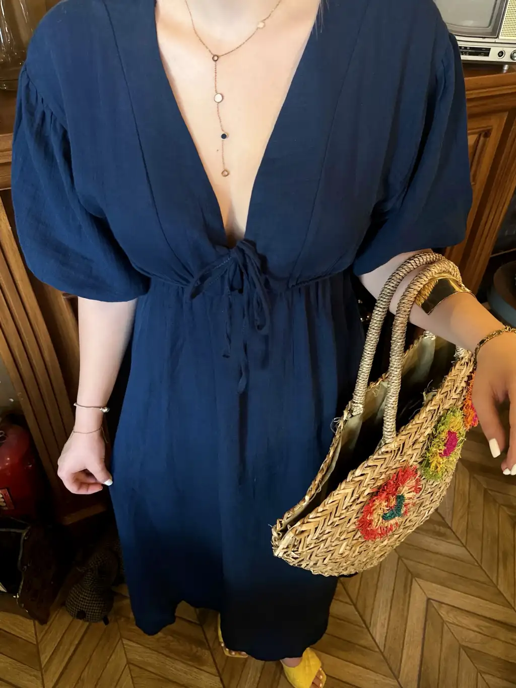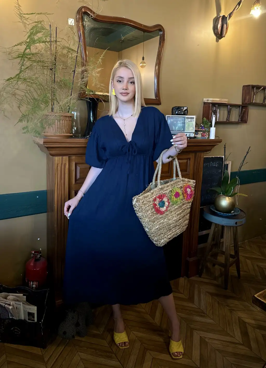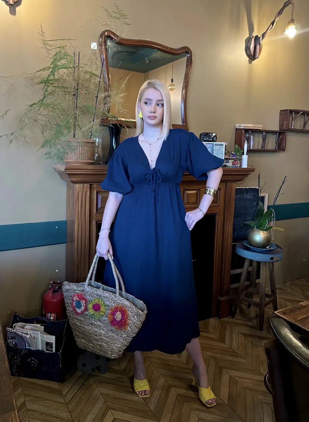Vayla Lacivert Müslin Kumaş Bağlama Detaylı Elbise