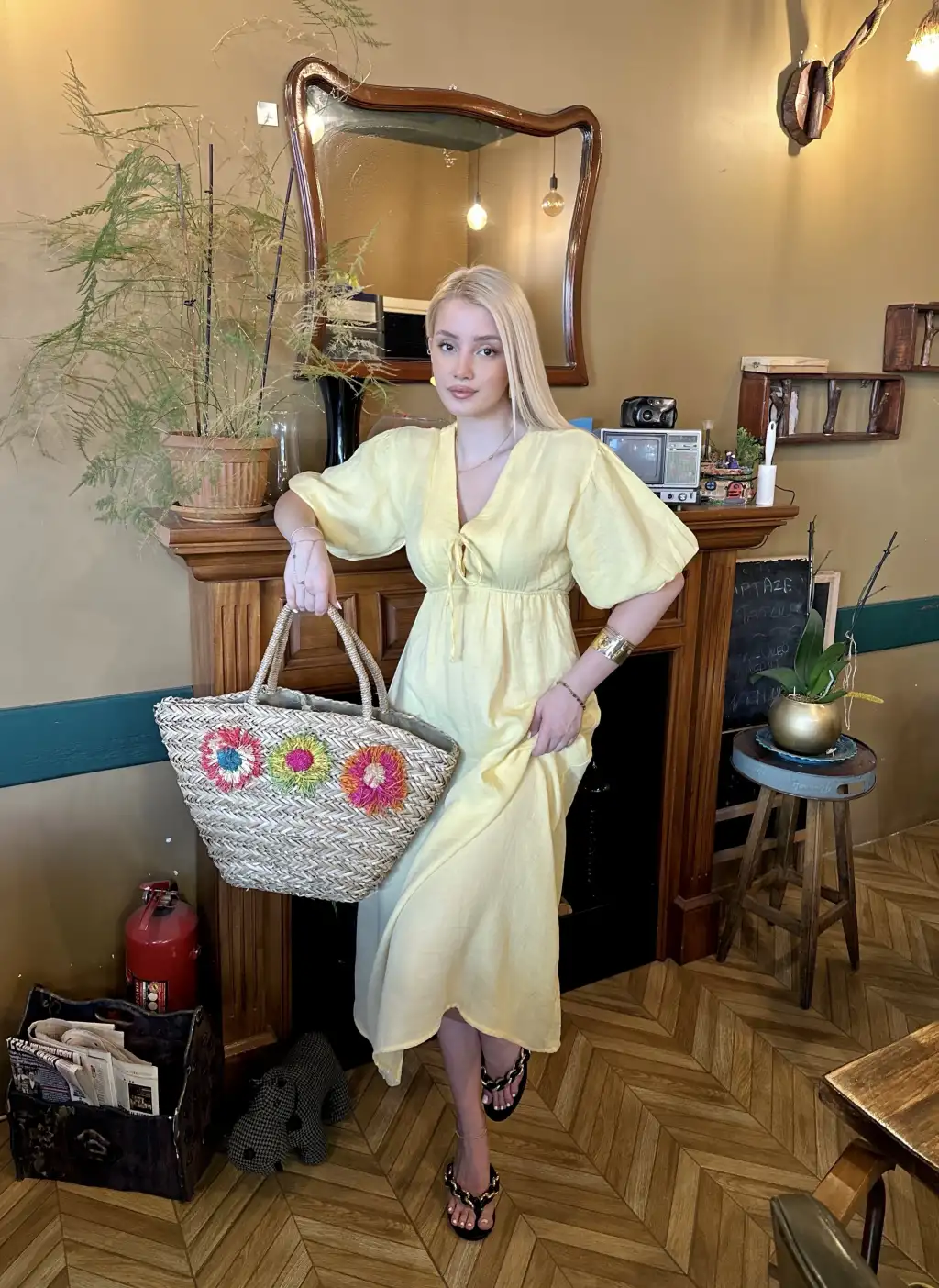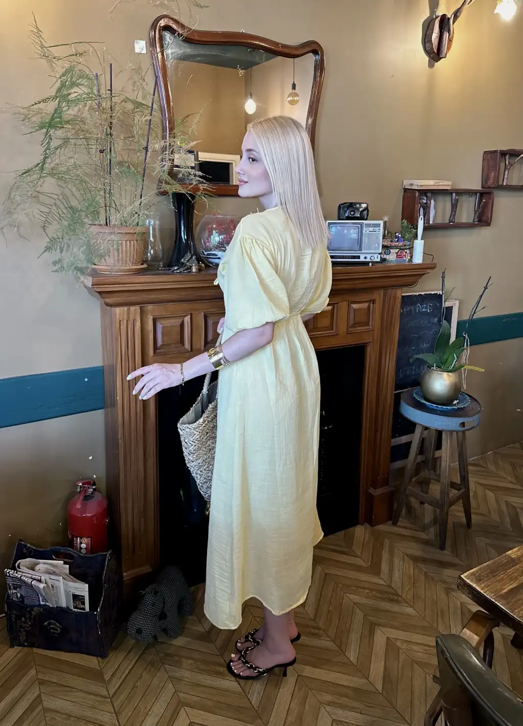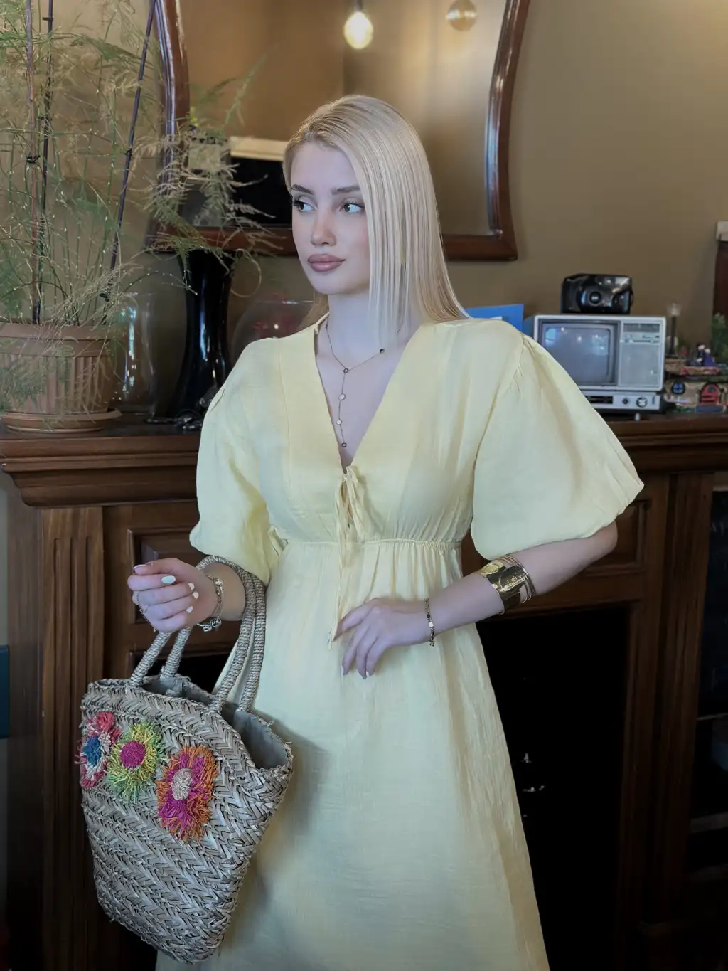 Vayla Pastel Sarı Müslin Kumaş Bağlama Detaylı Elbise