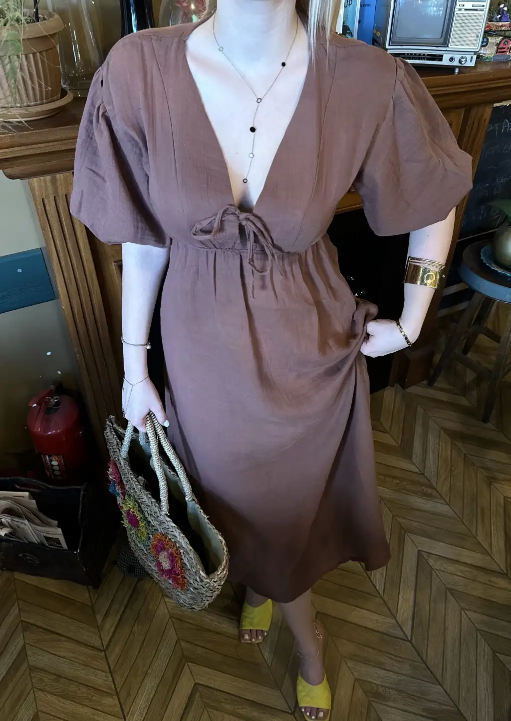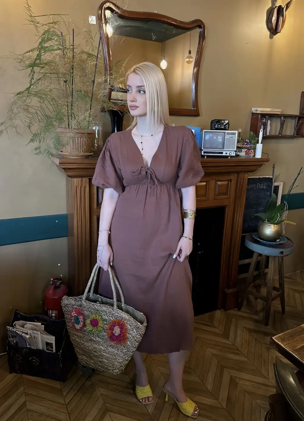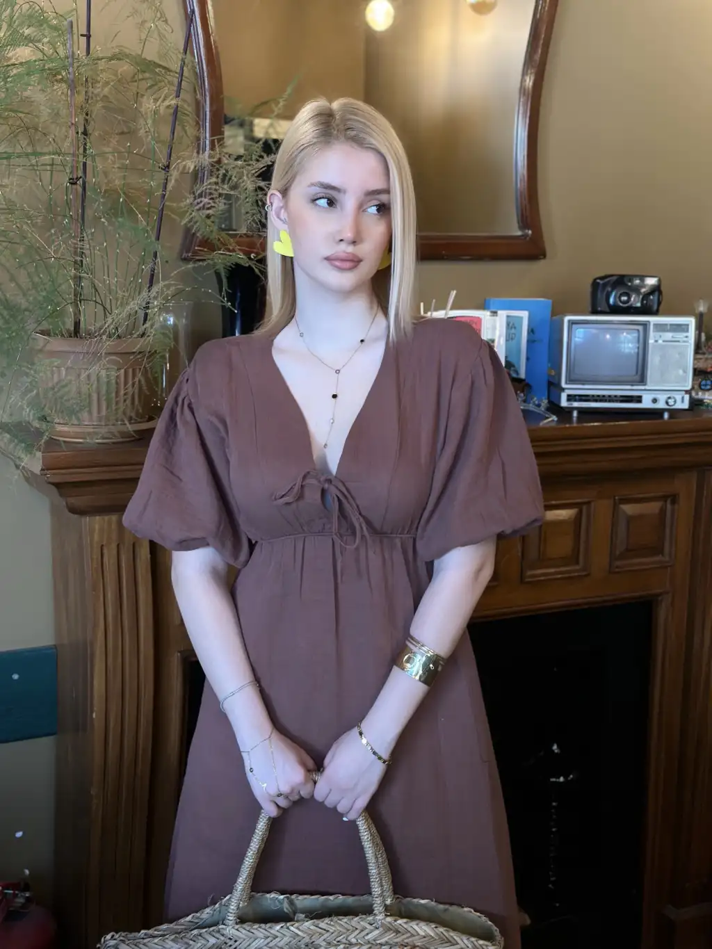 Vayla Kahve Müslin Kumaş Bağlama Detaylı Elbise