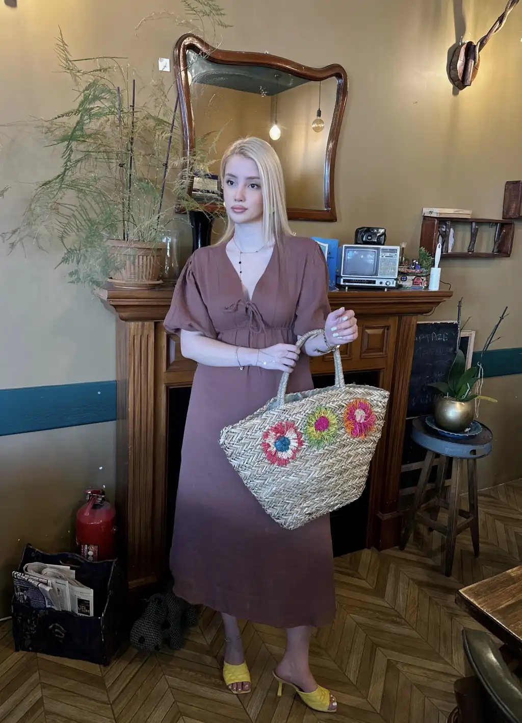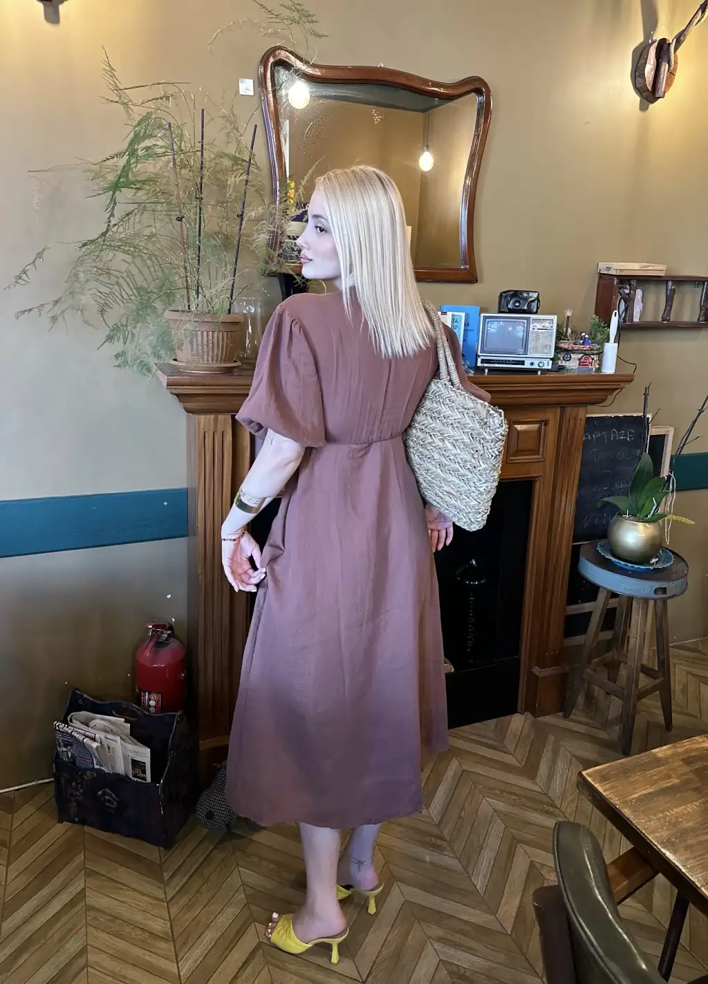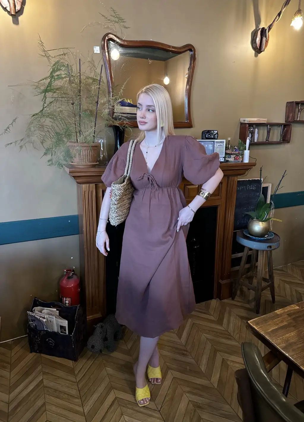 Vayla Kahve Müslin Kumaş Bağlama Detaylı Elbise