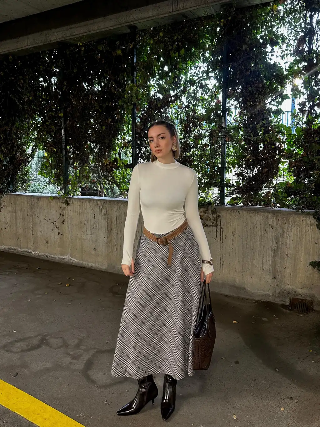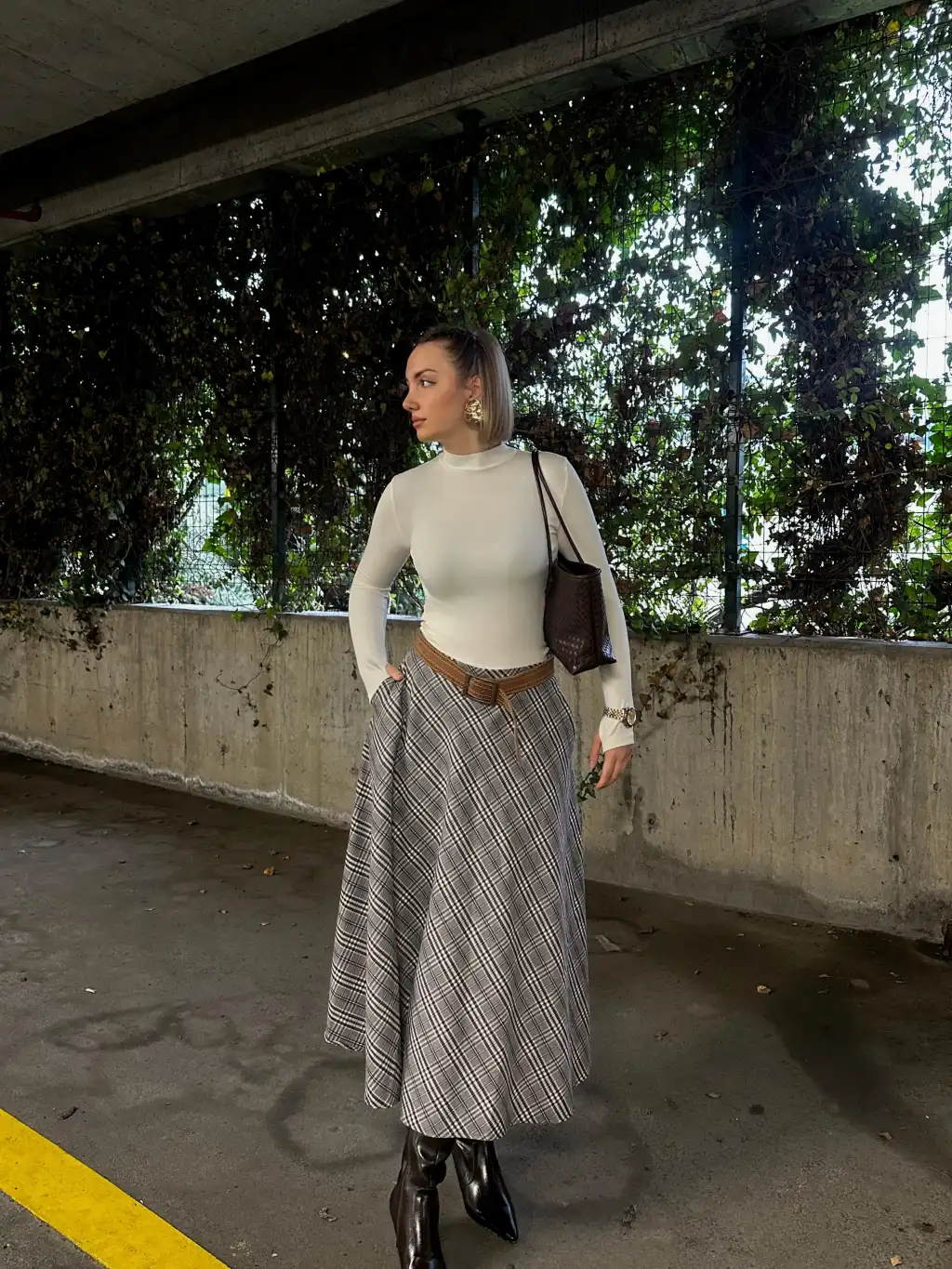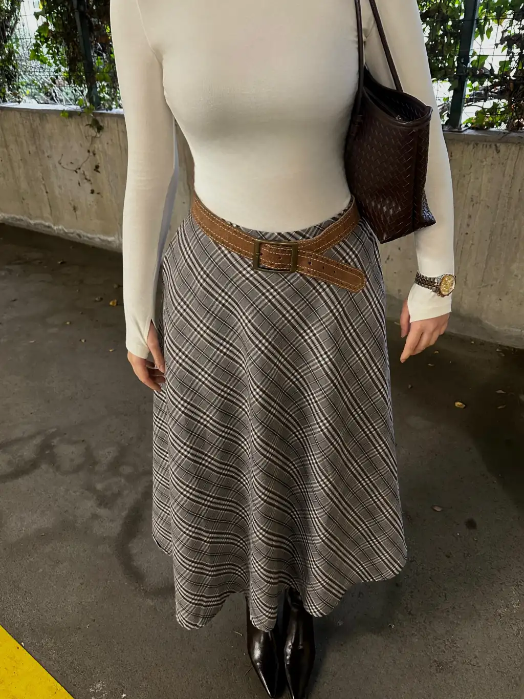 Volanlı Cepli Gri Ekose Oduncu Etek