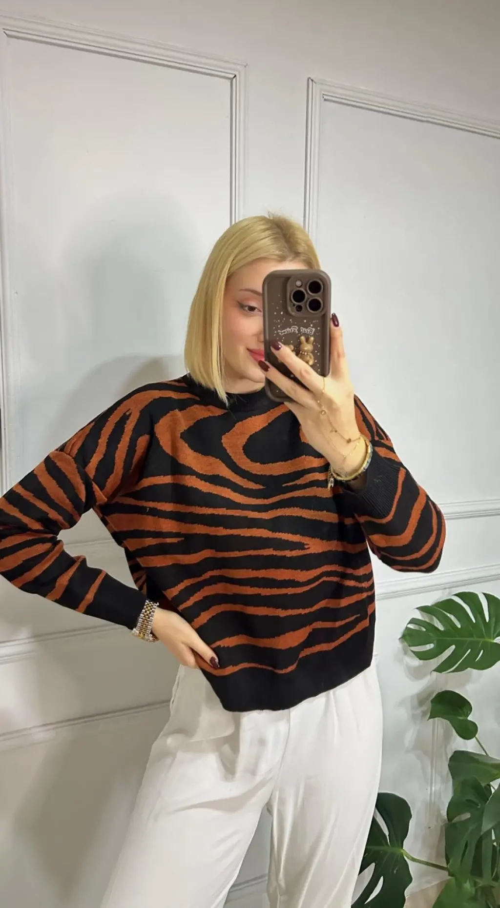 Zenya Kahverengi Zebra Desen Triko Kazak